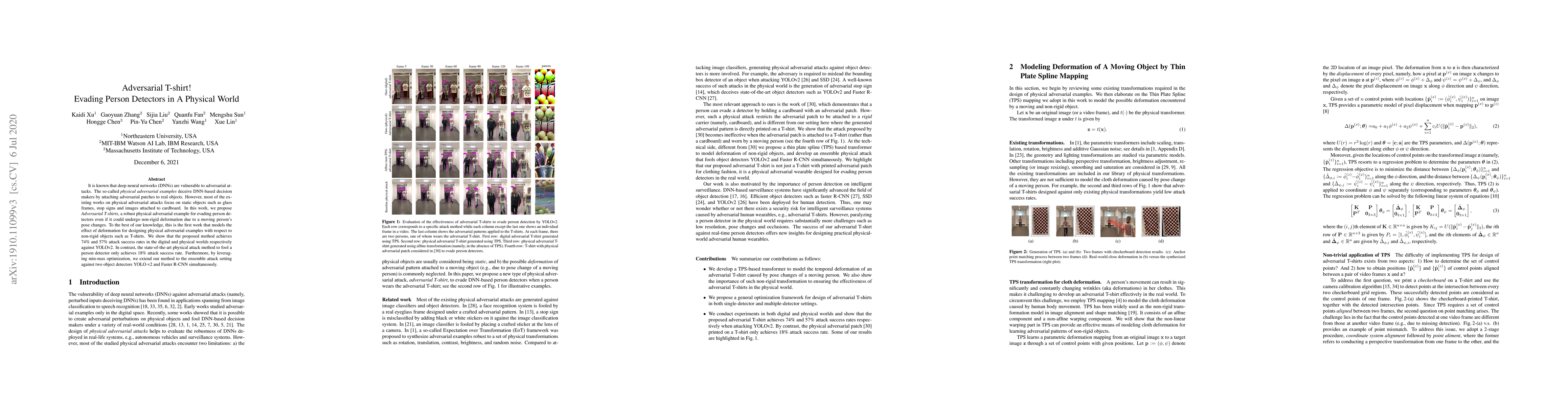 It is known that deep neural networks (DNNs) are vulnerable to adversarial attacks. The so-called physical adversarial examples deceive DNN-based decisionmakers by attaching adversarial patches to real objects. However, most of the existing works on physical adversarial attacks focus on static objects such as glass frames, stop signs and images attached to cardboard. In this work, we proposed adversarial T-shirts, a robust physical adversarial example for evading person detectors even if it could undergo non-rigid deformation due to a moving person's pose changes. To the best of our knowledge, this is the first work that models the effect of deformation for designing physical adversarial examples with respect to-rigid objects such as T-shirts. We show that the proposed method achieves74% and 57% attack success rates in the digital and physical worlds respectively against YOLOv2. In contrast, the state-of-the-art physical attack method to fool a person detector only achieves 18% attack success rate. Furthermore, by leveraging min-max optimization, we extend our method to the ensemble attack setting against two object detectors YOLO-v2 and Faster R-CNN simultaneously.