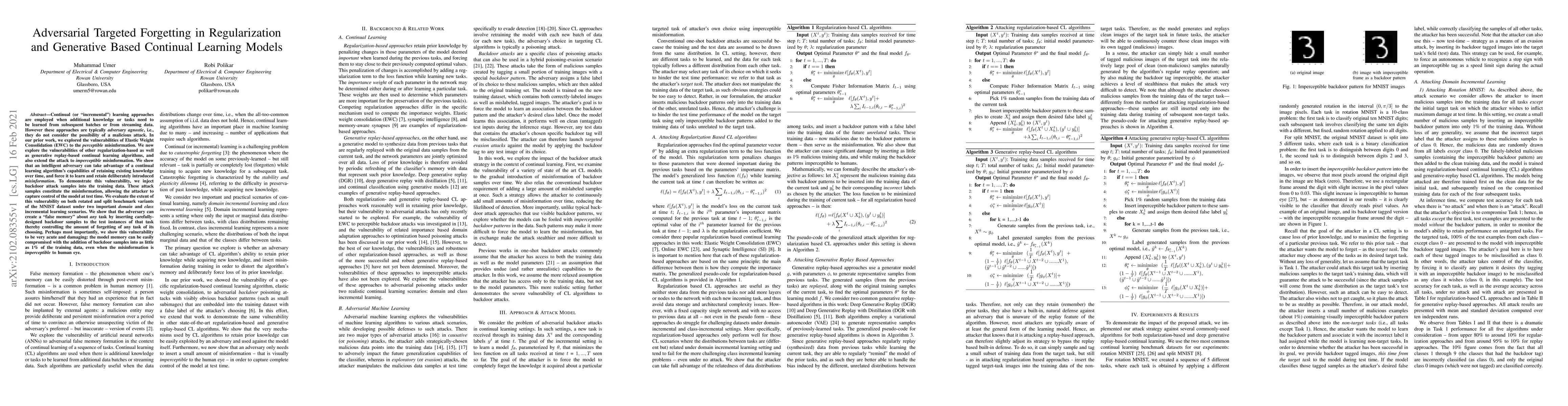 This paper investigates the vulnerabilities of continual learning models to adversarial targeted forgetting, demonstrating how maliciously introduced misinformation can be exploited to create "false memories" that compromise model performance. The study shows that even imperceptible backdoor samples can severely disrupt the model's ability to retain accurate knowledge, highlighting a significant security risk in regularization and generative-based continual learning approaches.