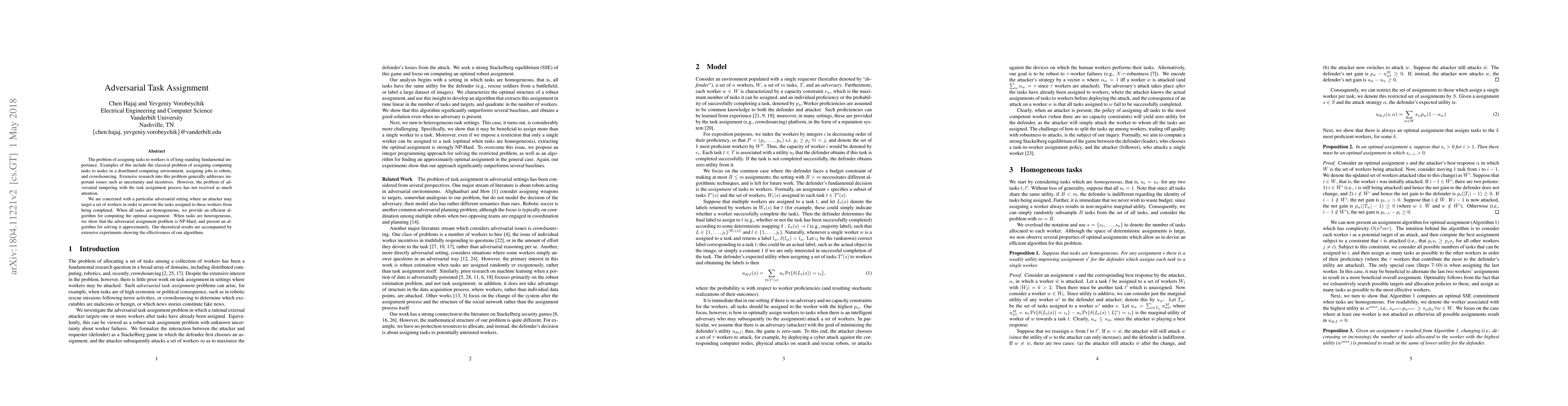 The problem of assigning tasks to workers is of long-standing fundamental importance. Examples of this include the classical problem of assigning computing tasks to nodes in a distributed computing environment, assigning jobs to robots, and crowdsourcing. Extensive research into this problem generally addresses important issues such as uncertainty and incentives. However, the problem of adversarial tampering with the task assignment process has not received as much attention. We are concerned with a particular adversarial setting where an attacker may target a set of workers in order to prevent the tasks assigned to these workers from being completed. When all tasks are homogeneous, we provide an efficient algorithm for computing the optimal assignment. When tasks are heterogeneous, we show that the adversarial assignment problem is NP-Hard, and present an algorithm for solving it approximately. Our theoretical results are accompanied by extensive experiments showing the effectiveness of our algorithms.
