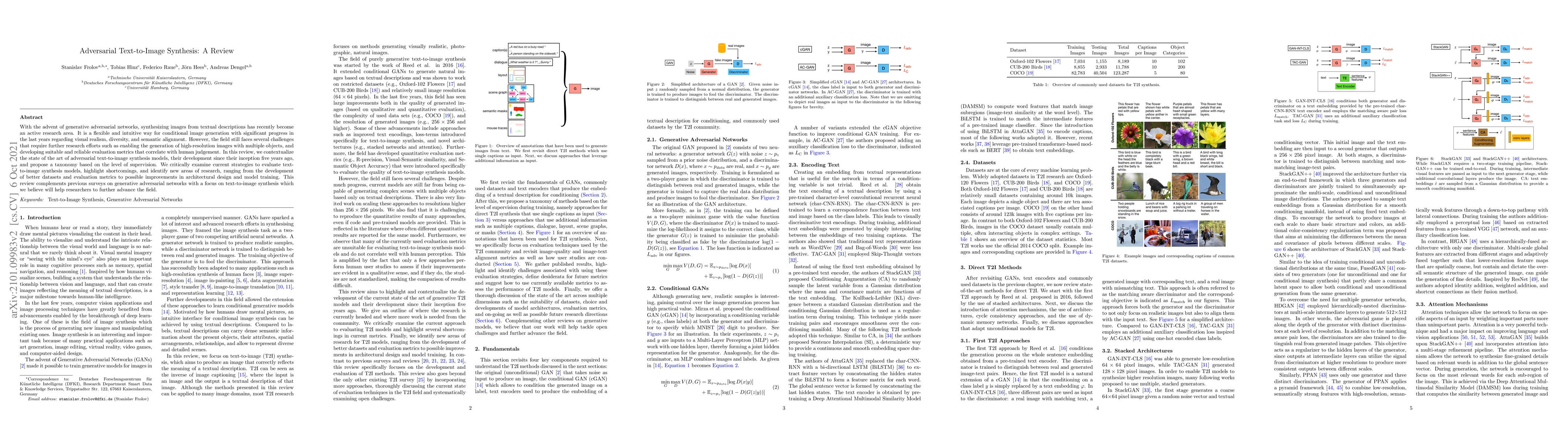 This review surveys the advancements in adversarial text-to-image synthesis, highlighting the progress in visual realism and semantic alignment, while also identifying challenges such as high-resolution generation and evaluation metrics. It proposes a taxonomy based on supervision levels and suggests new research directions for improving datasets, metrics, and model architectures.