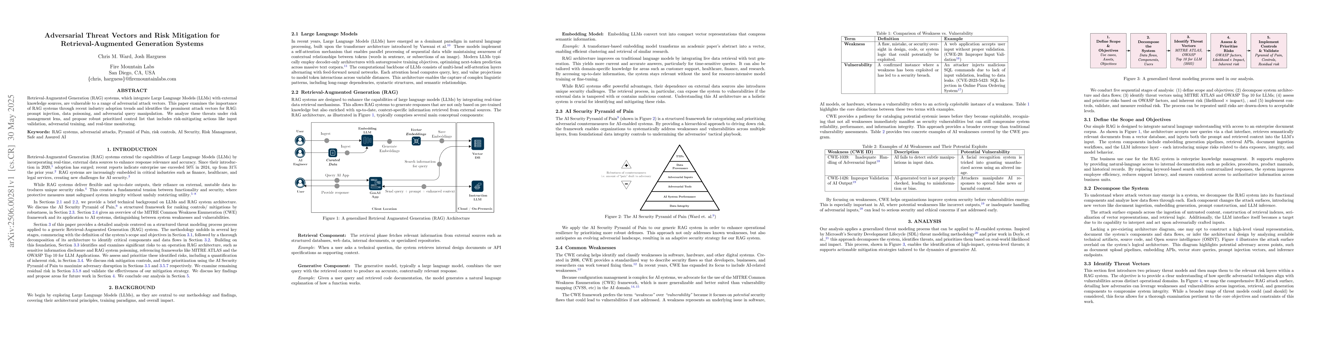 This paper examines Retrieval-Augmented Generation (RAG) systems, integrating Large Language Models (LLMs) with external knowledge sources, identifying adversarial attack vectors such as prompt injection, data poisoning, and adversarial query manipulation. It proposes a risk management approach with a prioritized control list including input validation, adversarial training, and real-time monitoring.