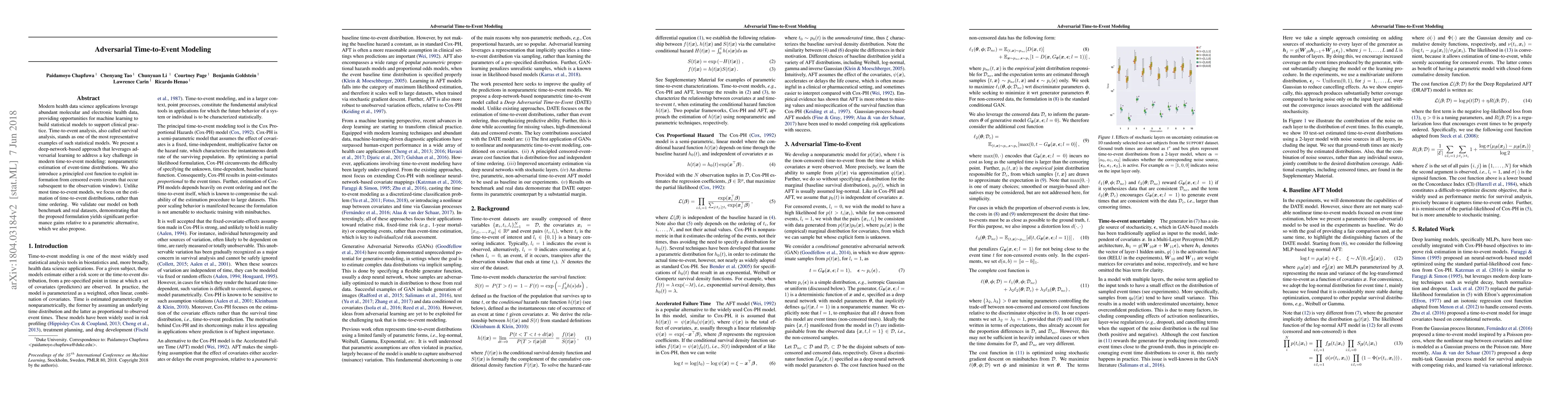 A deep-network-based approach using adversarial learning improves nonparametric estimation of event-time distributions in time-to-event modeling, outperforming parametric alternatives on benchmark and real datasets.