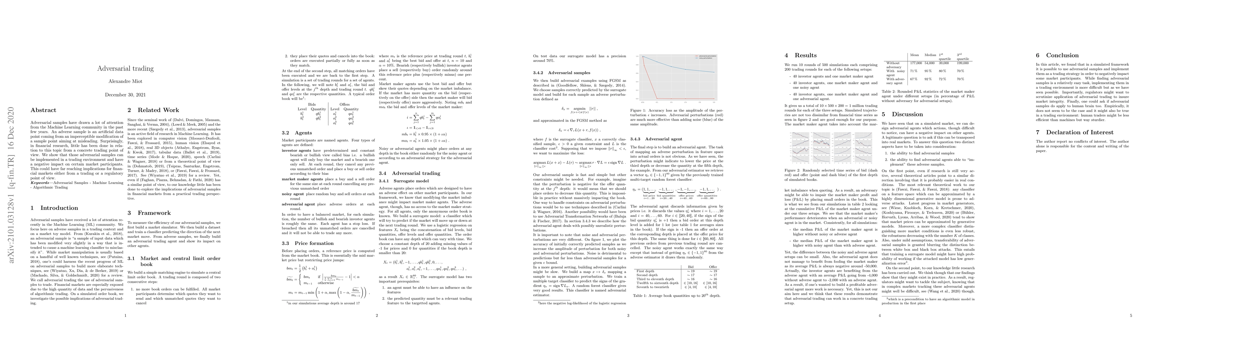 Adversarial samples have drawn a lot of attention from the Machine Learning community in the past few years. An adverse sample is an artificial data point coming from an imperceptible modification of a sample point aiming at misleading. Surprisingly, in financial research, little has been done in relation to this topic from a concrete trading point of view. We show that those adversarial samples can be implemented in a trading environment and have a negative impact on certain market participants. This could have far reaching implications for financial markets either from a trading or a regulatory point of view.
