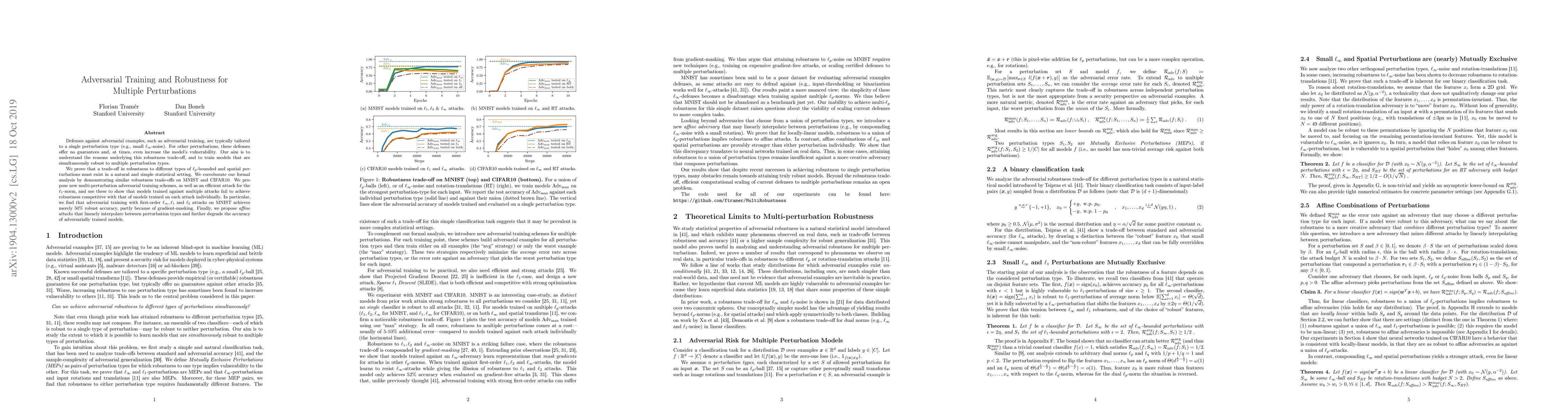 Defenses against adversarial examples, such as adversarial training, are typically tailored to a single perturbation type (e.g., small $\ell_\infty$-noise). For other perturbations, these defenses offer no guarantees and, at times, even increase the model's vulnerability. Our aim is to understand the reasons underlying this robustness trade-off, and to train models that are simultaneously robust to multiple perturbation types. We prove that a trade-off in robustness to different types of $\ell_p$-bounded and spatial perturbations must exist in a natural and simple statistical setting. We corroborate our formal analysis by demonstrating similar robustness trade-offs on MNIST and CIFAR10. Building upon new multi-perturbation adversarial training schemes, and a novel efficient attack for finding $\ell_1$-bounded adversarial examples, we show that no model trained against multiple attacks achieves robustness competitive with that of models trained on each attack individually. In particular, we uncover a pernicious gradient-masking phenomenon on MNIST, which causes adversarial training with first-order $\ell_\infty, \ell_1$ and $\ell_2$ adversaries to achieve merely $50\%$ accuracy. Our results question the viability and computational scalability of extending adversarial robustness, and adversarial training, to multiple perturbation types.