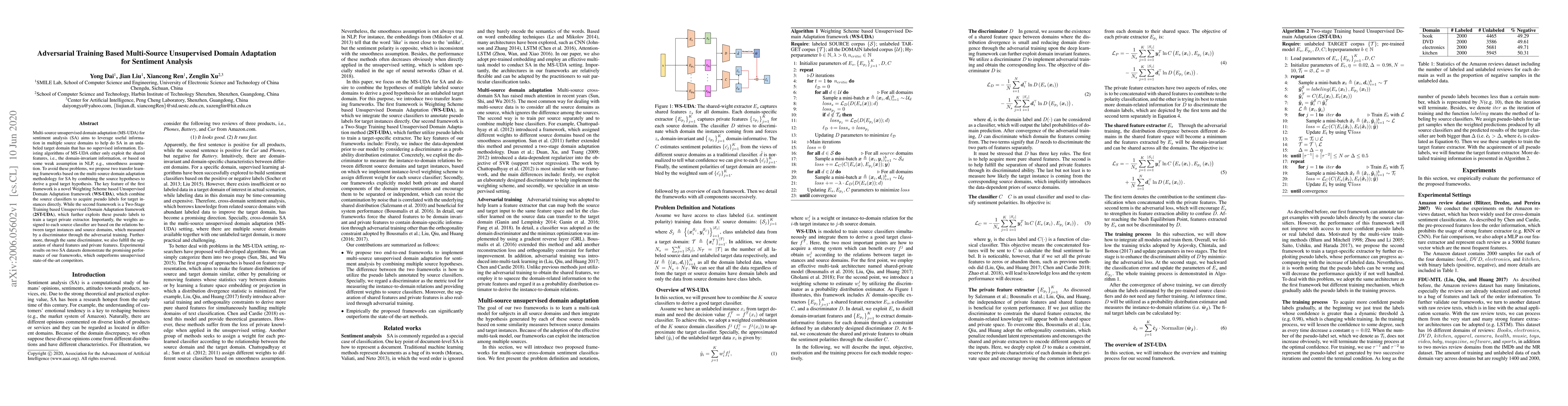 This paper proposes two novel frameworks for multi-source unsupervised domain adaptation (MS-UDA) in sentiment analysis, utilizing adversarial training to assign weights based on domain relations and separating shared and private features. The frameworks—WS-UDA and 2ST-UDA—outperform existing methods on sentiment analysis datasets.