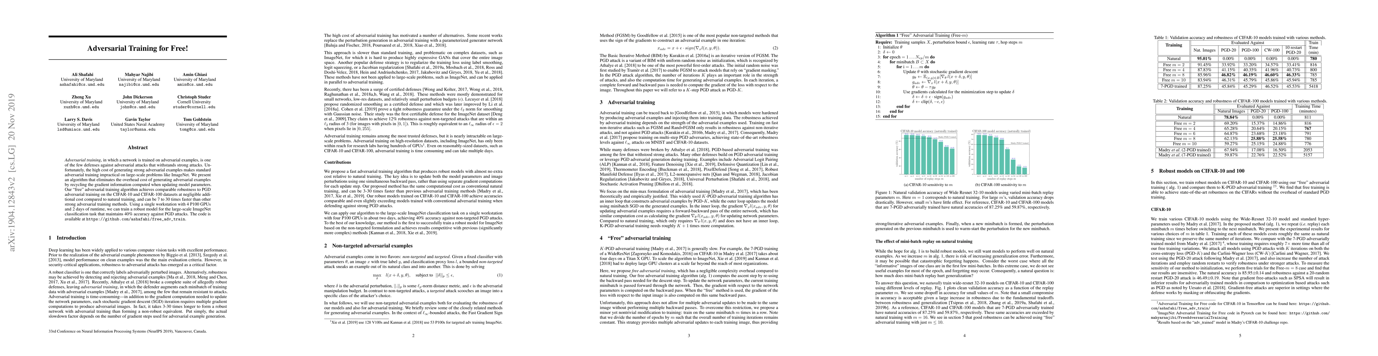 Adversarial training, in which a network is trained on adversarial examples, is one of the few defenses against adversarial attacks that withstands strong attacks. Unfortunately, the high cost of generating strong adversarial examples makes standard adversarial training impractical on large-scale problems like ImageNet. We present an algorithm that eliminates the overhead cost of generating adversarial examples by recycling the gradient information computed when updating model parameters. Our "free" adversarial training algorithm achieves comparable robustness to PGD adversarial training on the CIFAR-10 and CIFAR-100 datasets at negligible additional cost compared to natural training, and can be 7 to 30 times faster than other strong adversarial training methods. Using a single workstation with 4 P100 GPUs and 2 days of runtime, we can train a robust model for the large-scale ImageNet classification task that maintains 40% accuracy against PGD attacks. The code is available at https://github.com/ashafahi/free_adv_train.