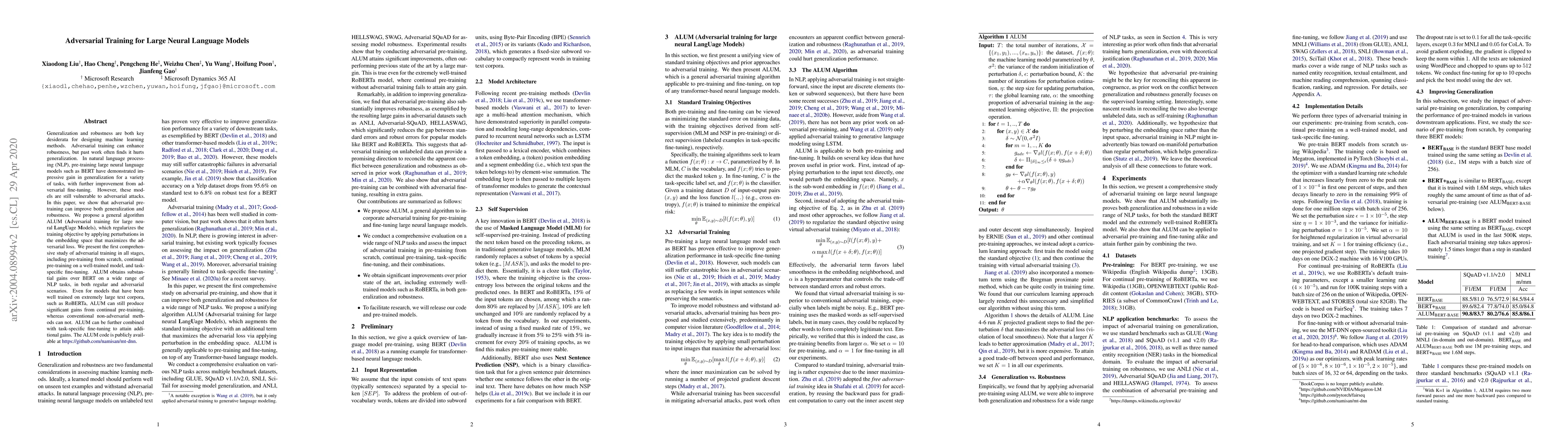 This paper proposes ALUM, an adversarial training algorithm that enhances both the generalization and robustness of large neural language models like BERT and RoBERTa. ALUM achieves substantial improvements across various NLP tasks by applying perturbations during pre-training, continual pre-training, and fine-tuning, and is publicly available for further research.