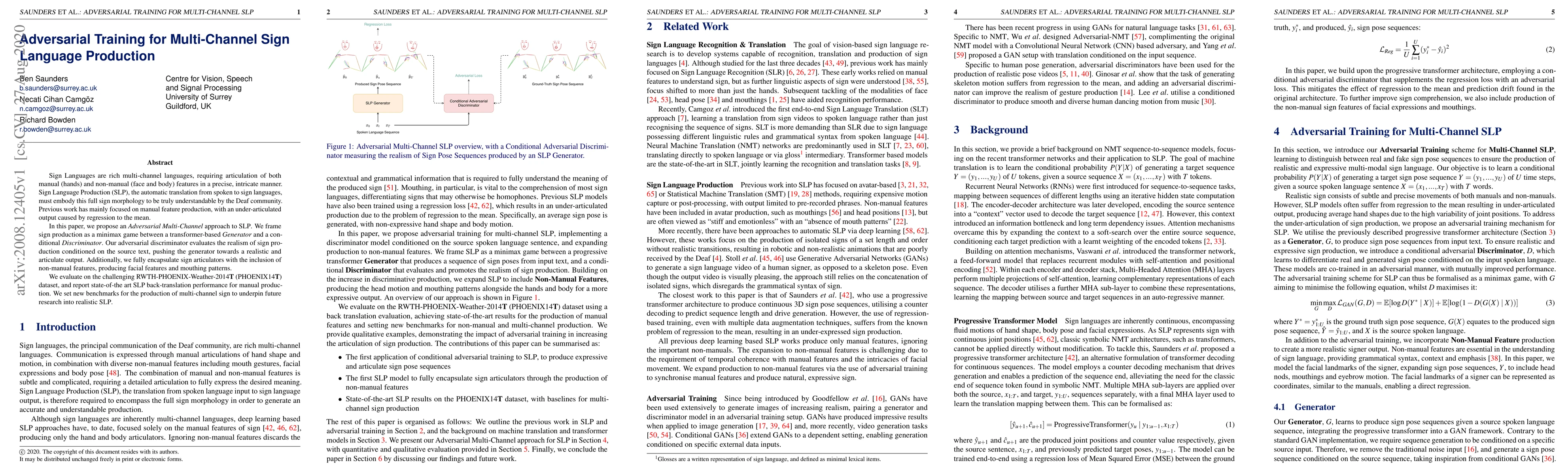 This paper proposes an Adversarial Multi-Channel approach for Sign Language Production (SLP), using a transformer-based Generator and Discriminator to improve realism and articulation. The method achieves state-of-the-art results on the PHOENIX14T dataset, setting new benchmarks for multi-channel sign language translation.