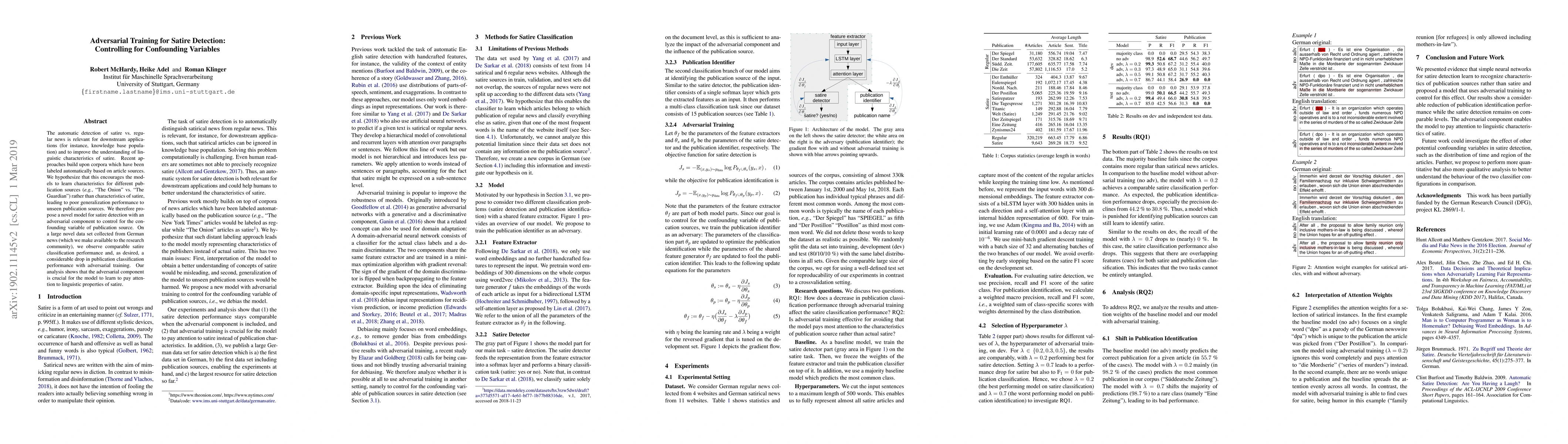 This paper proposes a novel adversarial training model for satire detection to address the issue of confounding variables from publication sources, achieving comparable classification performance while significantly reducing the model's reliance on publication source characteristics. The study demonstrates the importance of the adversarial component in focusing on satire's linguistic features.