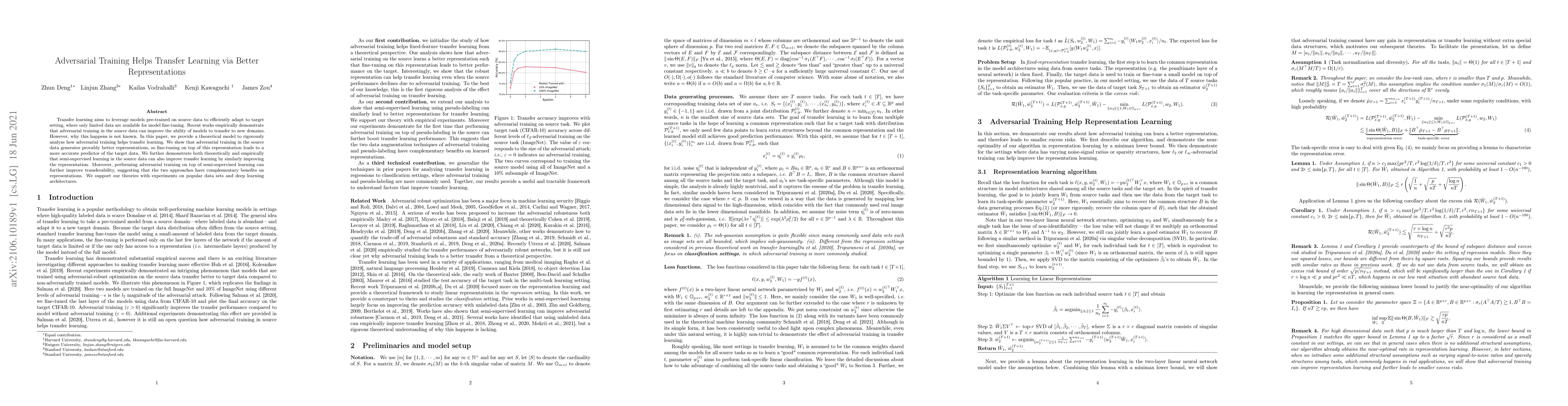 This paper theoretically analyzes how adversarial training enhances transfer learning by generating better representations in source data, which improves fine-tuning for target data. It also shows that semi-supervised learning and combining it with adversarial training can further boost transferability.