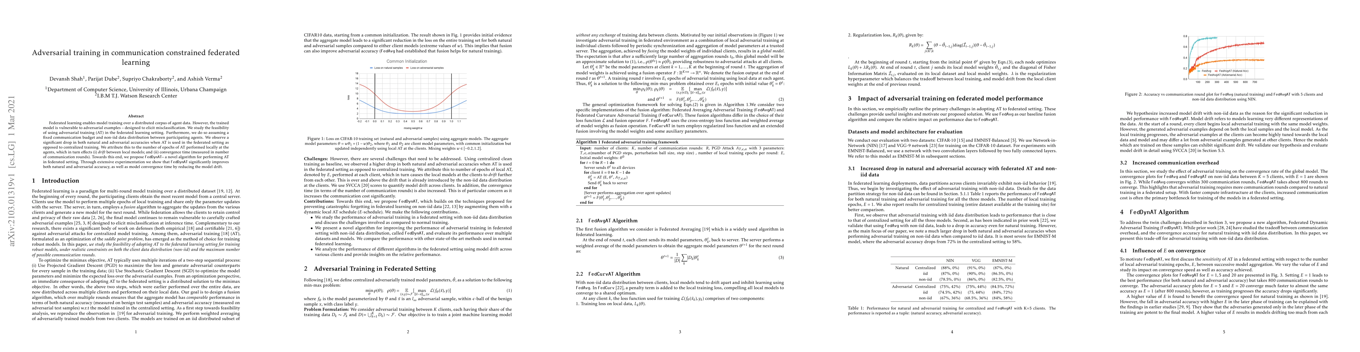 This paper investigates the application of adversarial training in federated learning under communication constraints and non-iid data distributions. The authors propose FedDynAT to address the drop in accuracy and convergence issues, demonstrating improved natural and adversarial accuracies.