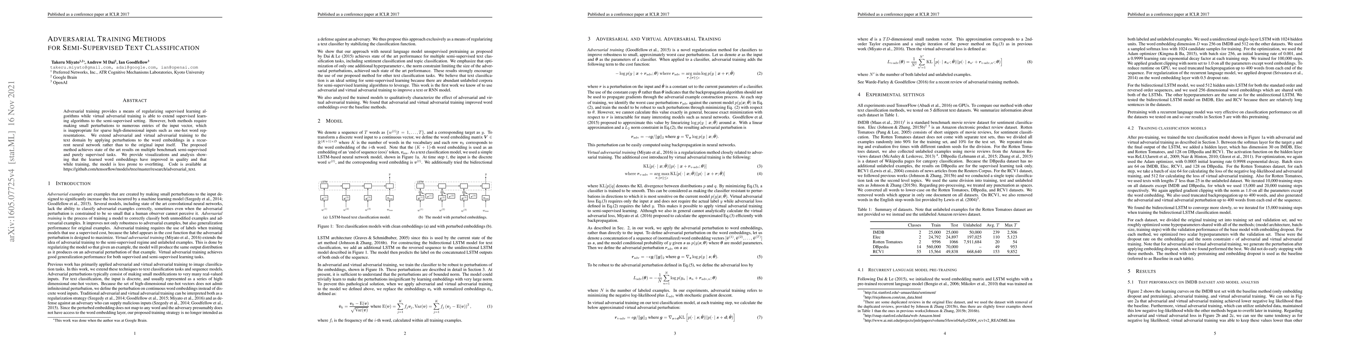 This paper proposes a method to extend adversarial training to semi-supervised text classification by perturbing word embeddings in a recurrent neural network instead of the input vector, achieving state-of-the-art results and improved model robustness. The method is shown to enhance word embeddings quality and reduce overfitting.