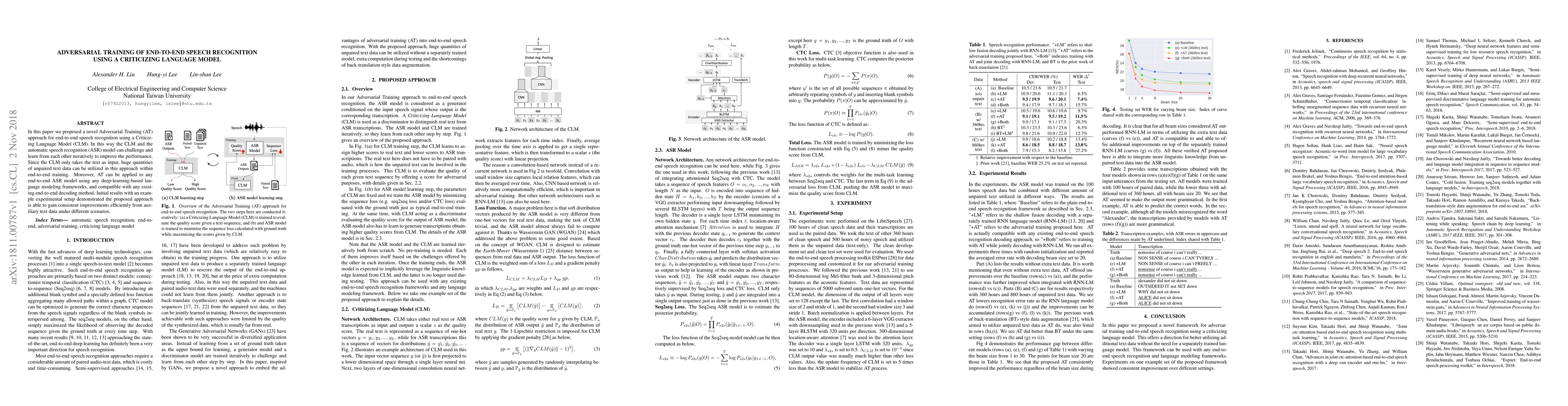 This paper proposes an Adversarial Training method for end-to-end speech recognition using a Criticizing Language Model (CLM) to iteratively improve the ASR model. The CLM leverages unpaired text data, enhancing performance without requiring paired audio-text data.