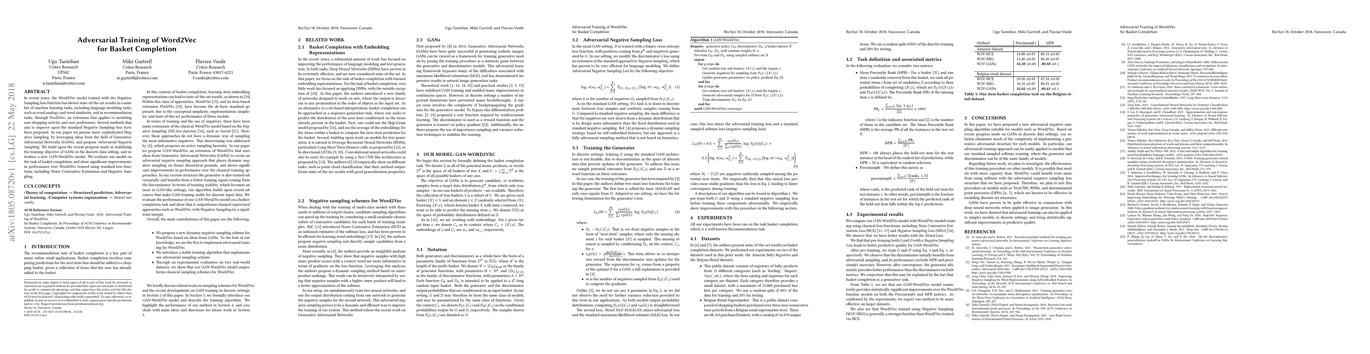 This paper proposes Adversarial Negative Sampling, a method that integrates Generative Adversarial Networks (GANs) into Word2Vec training, achieving better performance than standard Negative Sampling. The model is evaluated for basket completion, demonstrating significant improvements over traditional Word2Vec models.