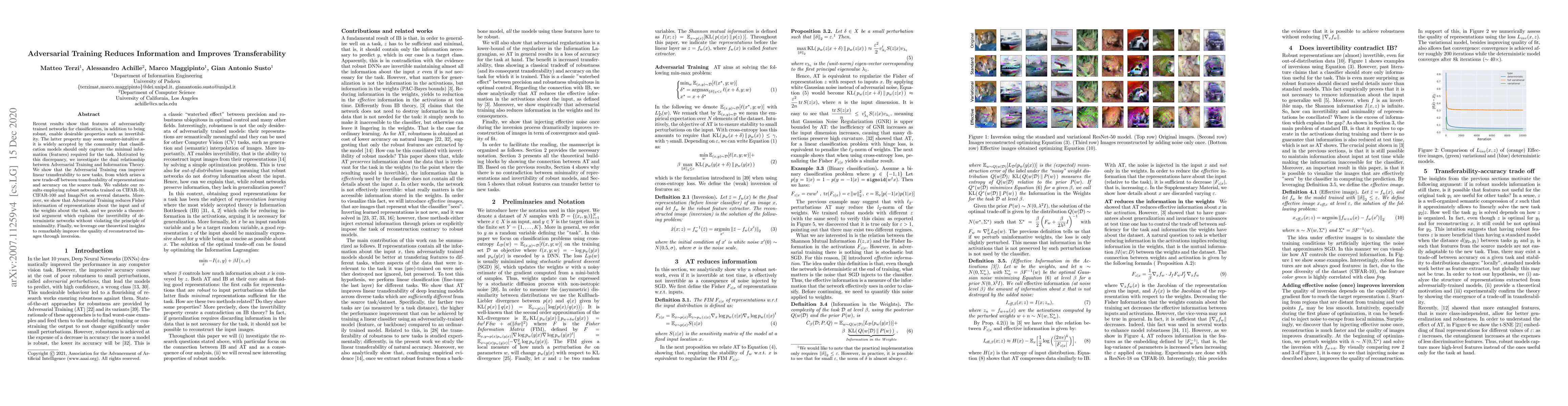 Adversarial Training reduces information in networks but enhances their transferability, leading to a trade-off between task accuracy and performance on new tasks, as demonstrated through robust networks on CIFAR and ImageNet datasets. Theoretical insights reveal how this training method achieves invertibility while adhering to minimal information principles.