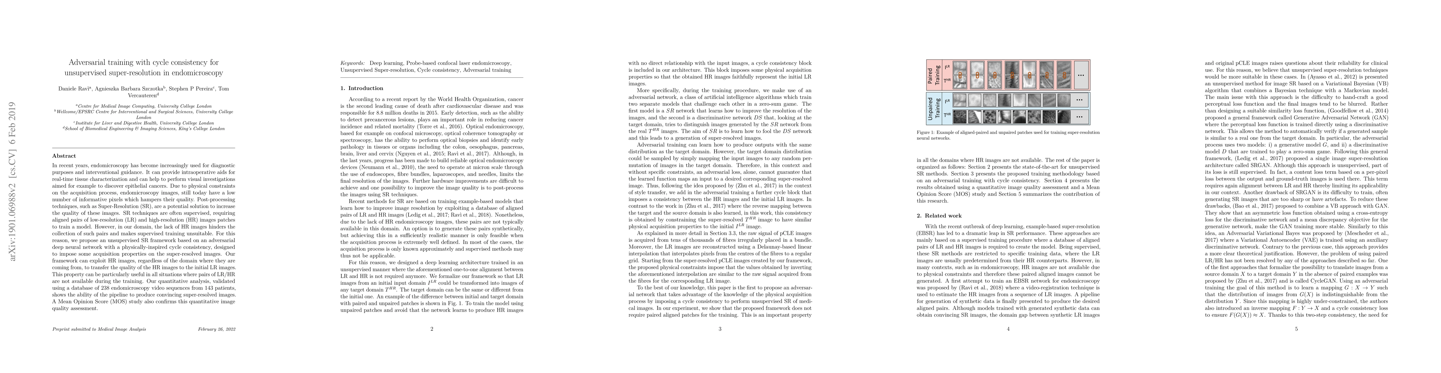 In recent years, endomicroscopy has become increasingly used for diagnostic purposes and interventional guidance. It can provide intraoperative aids for real-time tissue characterization and can help to perform visual investigations aimed for example to discover epithelial cancers. Due to physical constraints on the acquisition process, endomicroscopy images, still today have a low number of informative pixels which hampers their quality. Post-processing techniques, such as Super-Resolution (SR), are a potential solution to increase the quality of these images. SR techniques are often supervised, requiring aligned pairs of low-resolution (LR) and high-resolution (HR) images patches to train a model. However, in our domain, the lack of HR images hinders the collection of such pairs and makes supervised training unsuitable. For this reason, we propose an unsupervised SR framework based on an adversarial deep neural network with a physically-inspired cycle consistency, designed to impose some acquisition properties on the super-resolved images. Our framework can exploit HR images, regardless of the domain where they are coming from, to transfer the quality of the HR images to the initial LR images. This property can be particularly useful in all situations where pairs of LR/HR are not available during the training. Our quantitative analysis, validated using a database of 238 endomicroscopy video sequences from 143 patients, shows the ability of the pipeline to produce convincing super-resolved images. A Mean Opinion Score (MOS) study also confirms this quantitative image quality assessment.