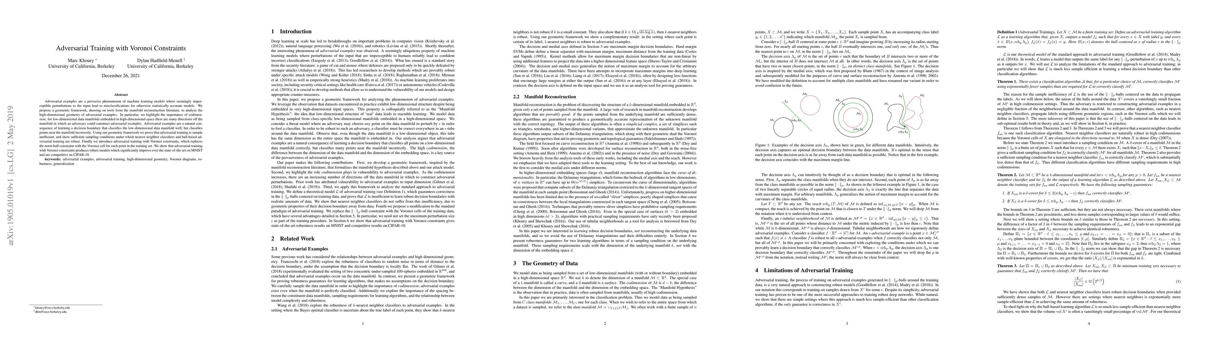 Adversarial examples are a pervasive phenomenon of machine learning models where seemingly imperceptible perturbations to the input lead to misclassifications for otherwise statistically accurate models. We propose a geometric framework, drawing on tools from the manifold reconstruction literature, to analyze the high-dimensional geometry of adversarial examples. In particular, we highlight the importance of codimension: for low-dimensional data manifolds embedded in high-dimensional space there are many directions off the manifold in which an adversary could construct adversarial examples. Adversarial examples are a natural consequence of learning a decision boundary that classifies the low-dimensional data manifold well, but classifies points near the manifold incorrectly. Using our geometric framework we prove that adversarial training is sample inefficient, and show sufficient sampling conditions under which nearest neighbor classifiers and ball-based adversarial training are robust. Finally we introduce adversarial training with Voronoi constraints, which replaces the norm ball constraint with the Voronoi cell for each point in the training set. We show that adversarial training with Voronoi constraints produces robust models which significantly improve over the state-of-the-art on MNIST and are competitive on CIFAR-10.