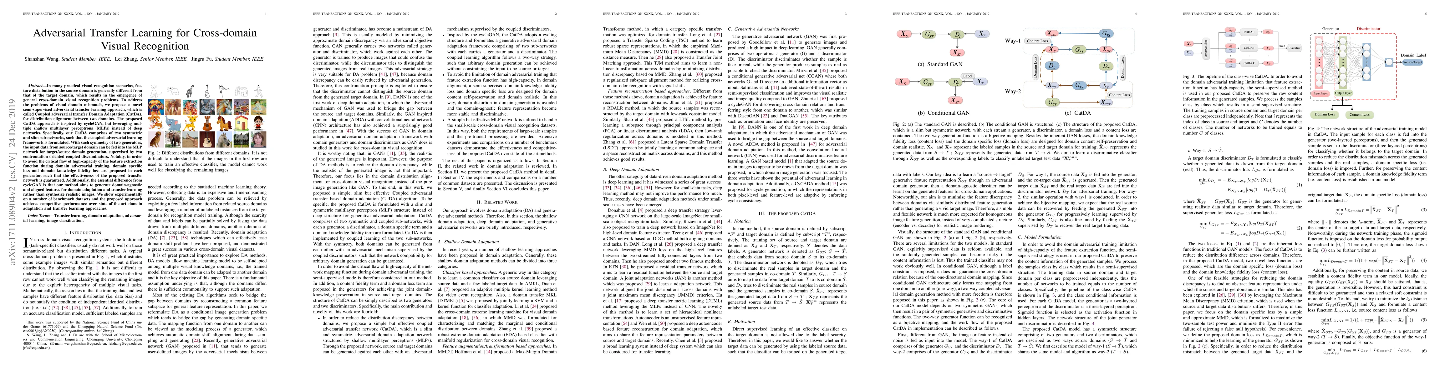 This paper proposes a semi-supervised adversarial transfer learning method called Coupled adversarial transfer Domain Adaptation (CatDA) to address cross-domain visual recognition problems. CatDA uses multiple shallow multilayer perceptrons to generate domain-agnostic features, achieving competitive performance on benchmark datasets.