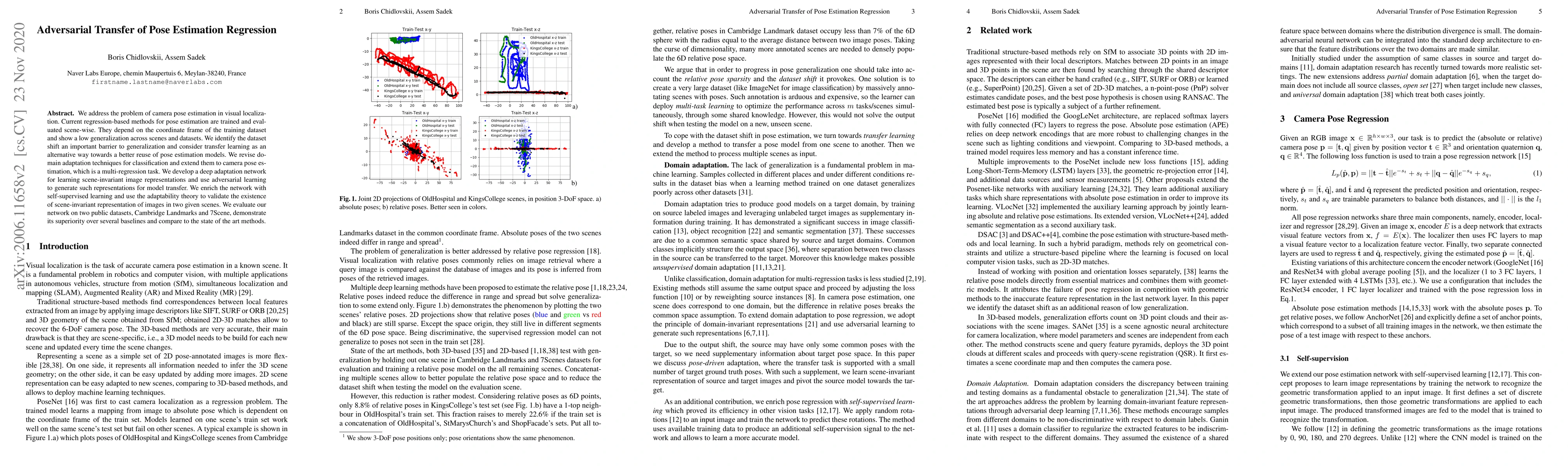 We address the problem of camera pose estimation in visual localization. Current regression-based methods for pose estimation are trained and evaluated scene-wise. They depend on the coordinate frame of the training dataset and show a low generalization across scenes and datasets. We identify the dataset shift an important barrier to generalization and consider transfer learning as an alternative way towards a better reuse of pose estimation models. We revise domain adaptation techniques for classification and extend them to camera pose estimation, which is a multi-regression task. We develop a deep adaptation network for learning scene-invariant image representations and use adversarial learning to generate such representations for model transfer. We enrich the network with self-supervised learning and use the adaptability theory to validate the existence of scene-invariant representation of images in two given scenes. We evaluate our network on two public datasets, Cambridge Landmarks and 7Scene, demonstrate its superiority over several baselines and compare to the state of the art methods.