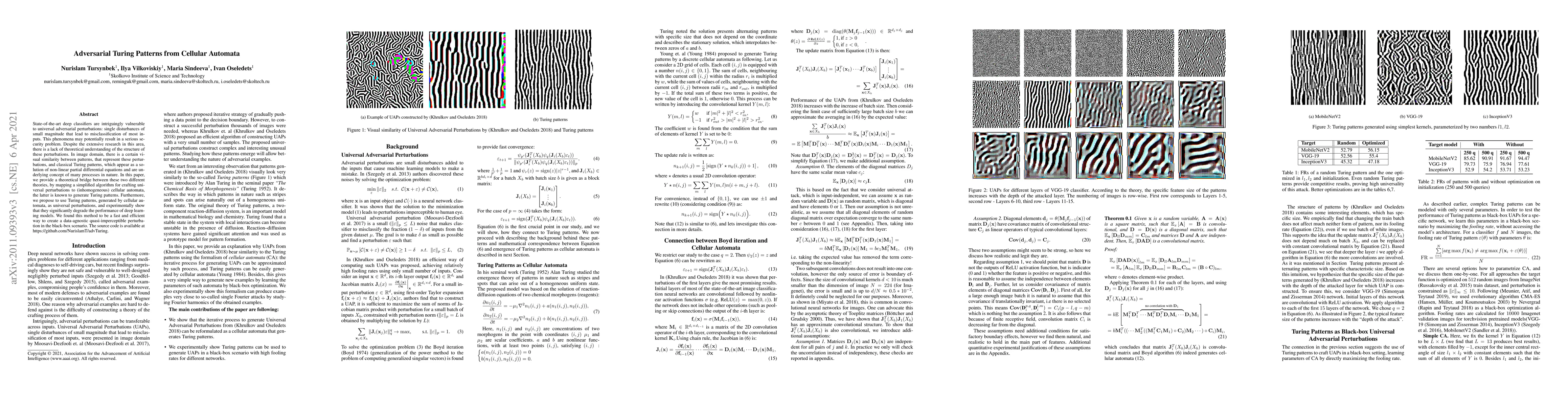 State-of-the-art deep classifiers are intriguingly vulnerable to universal adversarial perturbations: single disturbances of small magnitude that lead to misclassification of most in-puts. This phenomena may potentially result in a serious security problem. Despite the extensive research in this area,there is a lack of theoretical understanding of the structure of these perturbations. In image domain, there is a certain visual similarity between patterns, that represent these perturbations, and classical Turing patterns, which appear as a solution of non-linear partial differential equations and are underlying concept of many processes in nature. In this paper,we provide a theoretical bridge between these two different theories, by mapping a simplified algorithm for crafting universal perturbations to (inhomogeneous) cellular automata,the latter is known to generate Turing patterns. Furthermore,we propose to use Turing patterns, generated by cellular automata, as universal perturbations, and experimentally show that they significantly degrade the performance of deep learning models. We found this method to be a fast and efficient way to create a data-agnostic quasi-imperceptible perturbation in the black-box scenario. The source code is available at https://github.com/NurislamT/advTuring.