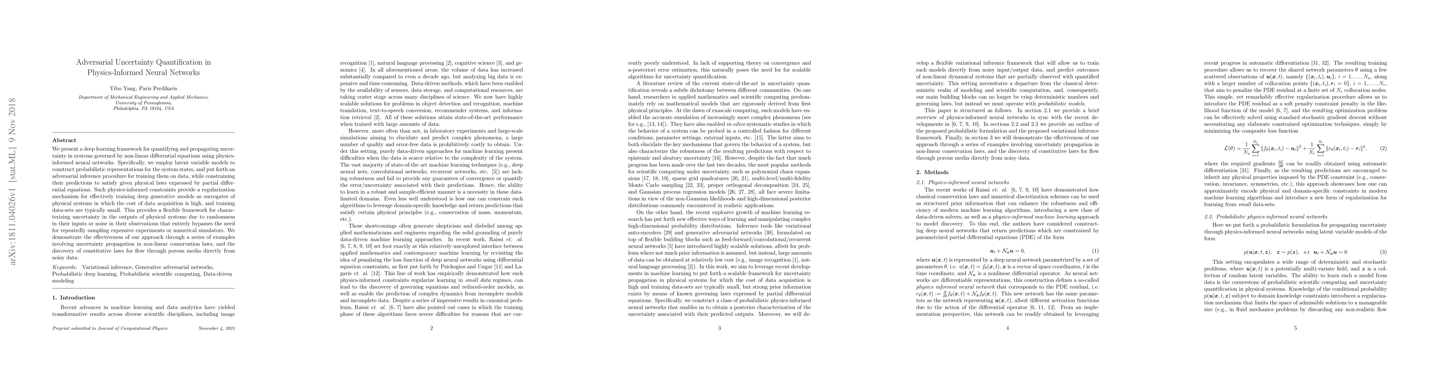 We present a deep learning framework for quantifying and propagating uncertainty in systems governed by non-linear differential equations using physics-informed neural networks. Specifically, we employ latent variable models to construct probabilistic representations for the system states, and put forth an adversarial inference procedure for training them on data, while constraining their predictions to satisfy given physical laws expressed by partial differential equations. Such physics-informed constraints provide a regularization mechanism for effectively training deep generative models as surrogates of physical systems in which the cost of data acquisition is high, and training data-sets are typically small. This provides a flexible framework for characterizing uncertainty in the outputs of physical systems due to randomness in their inputs or noise in their observations that entirely bypasses the need for repeatedly sampling expensive experiments or numerical simulators. We demonstrate the effectiveness of our approach through a series of examples involving uncertainty propagation in non-linear conservation laws, and the discovery of constitutive laws for flow through porous media directly from noisy data.