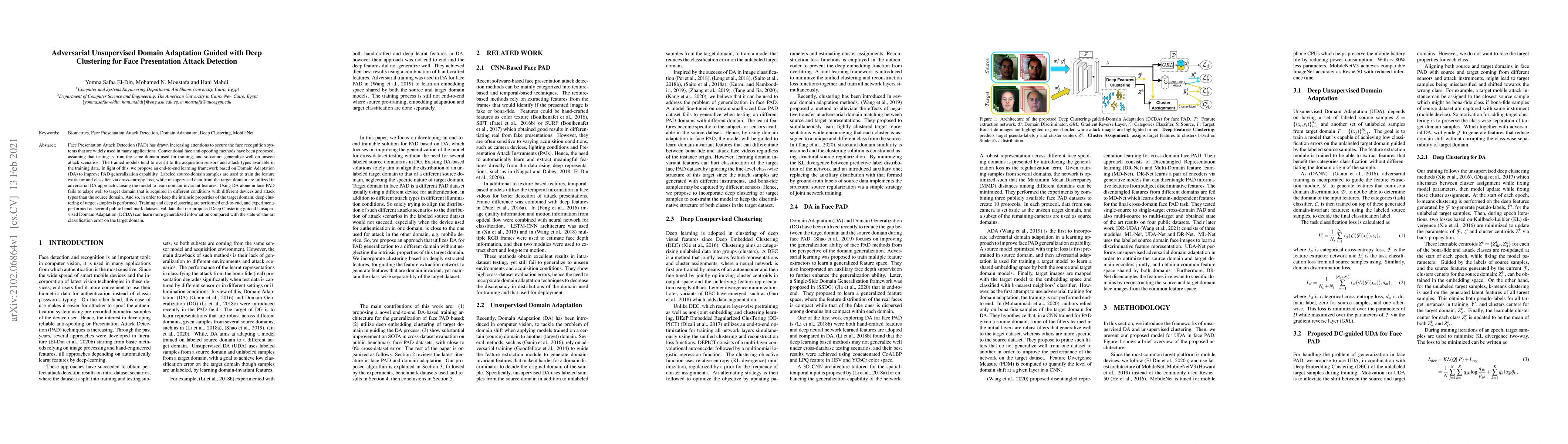 This paper proposes an end-to-end Deep Clustering guided Unsupervised Domain Adaptation (DCDA) framework for Face Presentation Attack Detection (PAD) to improve model generalization across different sensors and attack types. The method combines domain adaptation with deep clustering to learn domain-invariant features and retain intrinsic properties of the target domain, leading to better performance on unseen attack scenarios.