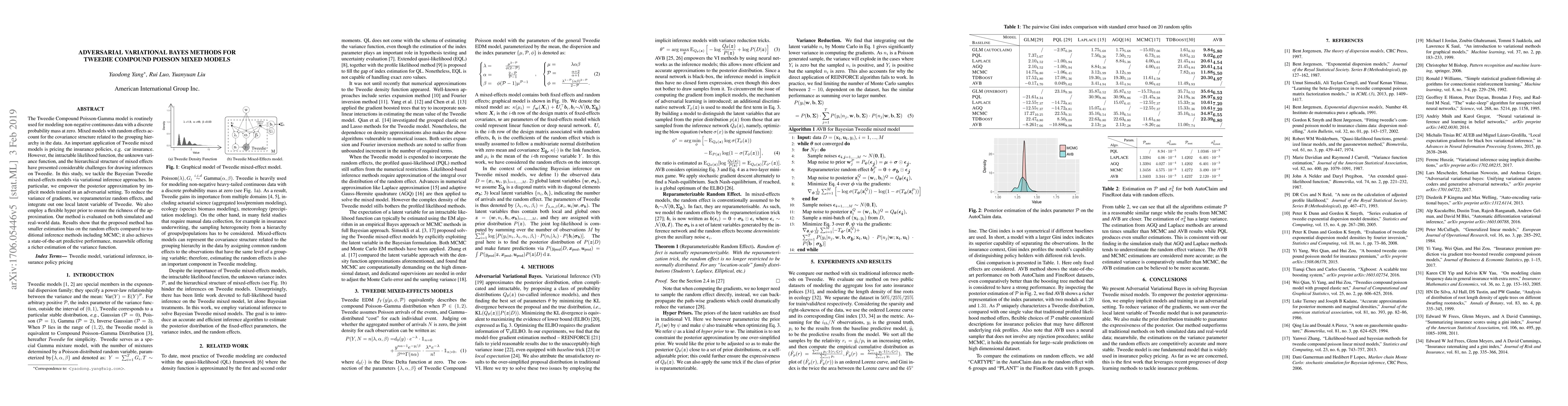 This paper proposes an adversarial variational Bayes method for Tweedie Compound Poisson mixed models, addressing challenges in likelihood computation and variance function estimation. The approach achieves lower estimation bias and better predictive performance compared to traditional MCMC methods.