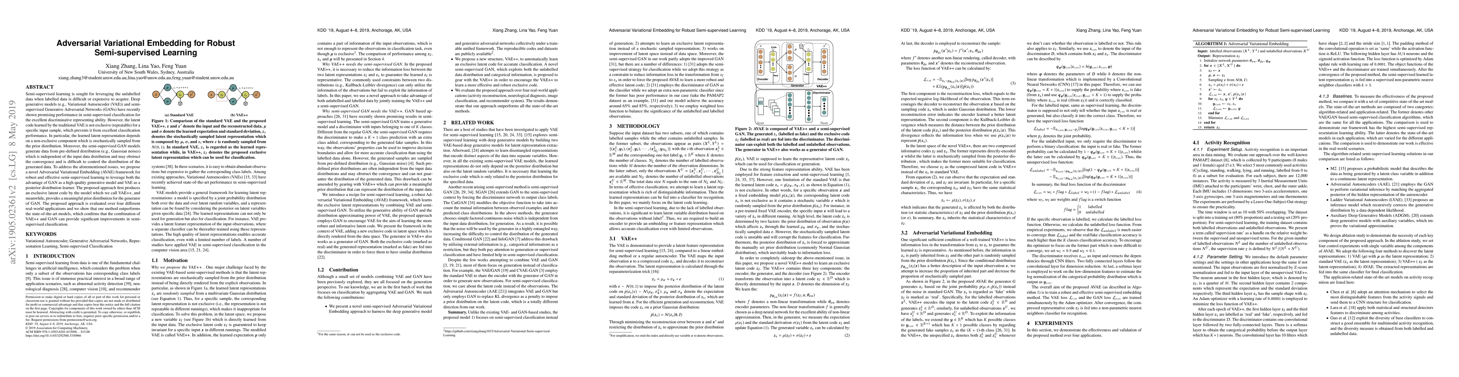 Semi-supervised learning is sought for leveraging the unlabelled data when labelled data is difficult or expensive to acquire. Deep generative models (e.g., Variational Autoencoder (VAE)) and semisupervised Generative Adversarial Networks (GANs) have recently shown promising performance in semi-supervised classification for the excellent discriminative representing ability. However, the latent code learned by the traditional VAE is not exclusive (repeatable) for a specific input sample, which prevents it from excellent classification performance. In particular, the learned latent representation depends on a non-exclusive component which is stochastically sampled from the prior distribution. Moreover, the semi-supervised GAN models generate data from pre-defined distribution (e.g., Gaussian noises) which is independent of the input data distribution and may obstruct the convergence and is difficult to control the distribution of the generated data. To address the aforementioned issues, we propose a novel Adversarial Variational Embedding (AVAE) framework for robust and effective semi-supervised learning to leverage both the advantage of GAN as a high quality generative model and VAE as a posterior distribution learner. The proposed approach first produces an exclusive latent code by the model which we call VAE++, and meanwhile, provides a meaningful prior distribution for the generator of GAN. The proposed approach is evaluated over four different real-world applications and we show that our method outperforms the state-of-the-art models, which confirms that the combination of VAE++ and GAN can provide significant improvements in semisupervised classification.