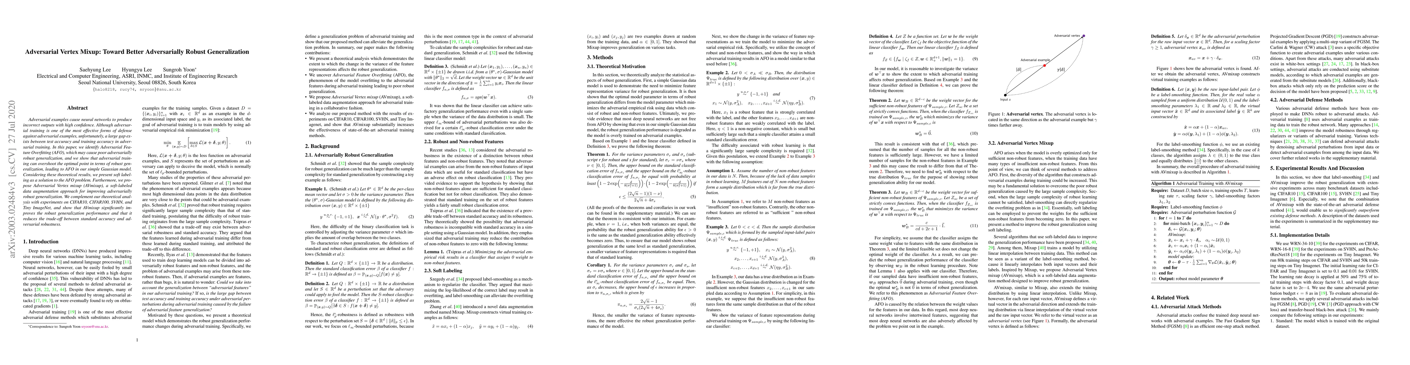 This paper identifies Adversarial Feature Overfitting (AFO) as a cause for poor adversarial generalization and proposes Adversarial Vertex mixup (AVmixup) to mitigate it. AVmixup, a soft-labeled data augmentation technique, improves robust generalization and reduces the trade-off between standard accuracy and adversarial robustness, as demonstrated through experiments on multiple datasets.