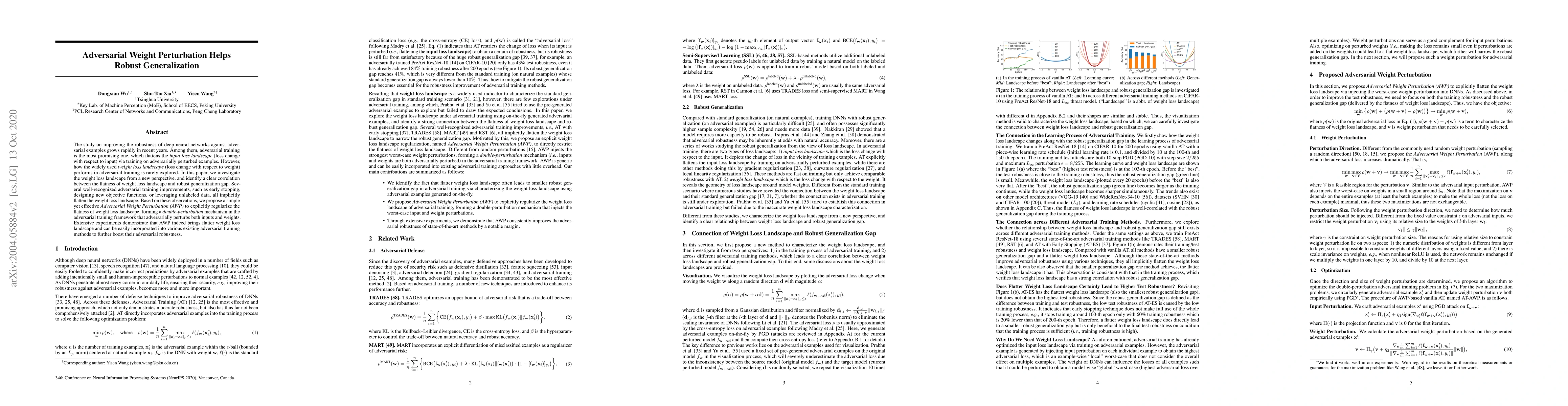This paper explores the relationship between the flatness of the weight loss landscape and robust generalization in adversarial training, proposing Adversarial Weight Perturbation (AWP) to explicitly regularize this flatness. Experiments show that AWP enhances adversarial robustness by integrating a double-perturbation mechanism in training.