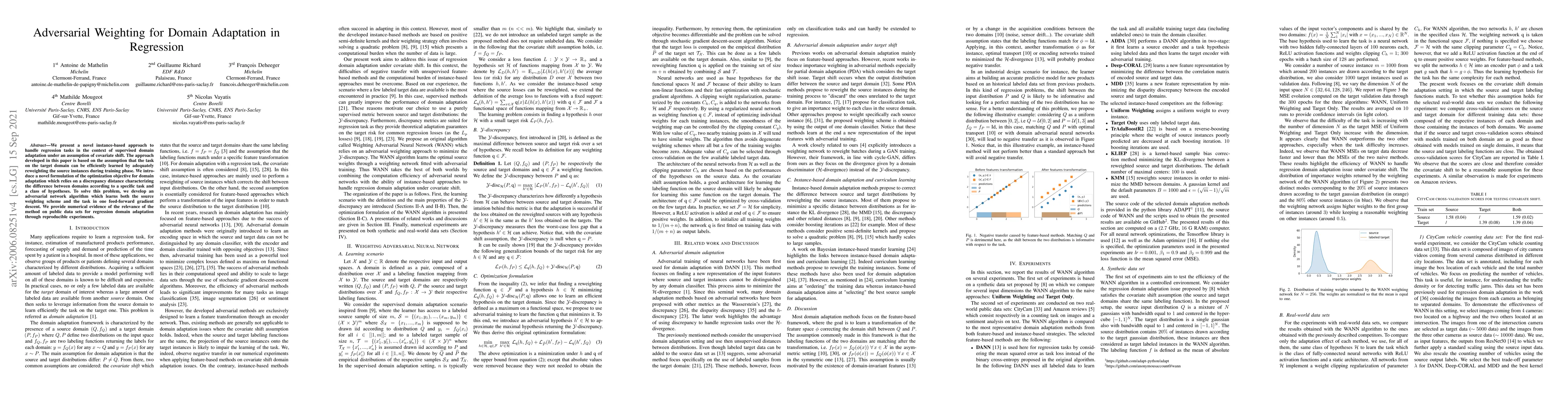 We present a novel instance-based approach to handle regression tasks in the context of supervised domain adaptation under an assumption of covariate shift. The approach developed in this paper is based on the assumption that the task on the target domain can be efficiently learned by adequately reweighting the source instances during training phase. We introduce a novel formulation of the optimization objective for domain adaptation which relies on a discrepancy distance characterizing the difference between domains according to a specific task and a class of hypotheses. To solve this problem, we develop an adversarial network algorithm which learns both the source weighting scheme and the task in one feed-forward gradient descent. We provide numerical evidence of the relevance of the method on public data sets for regression domain adaptation through reproducible experiments.