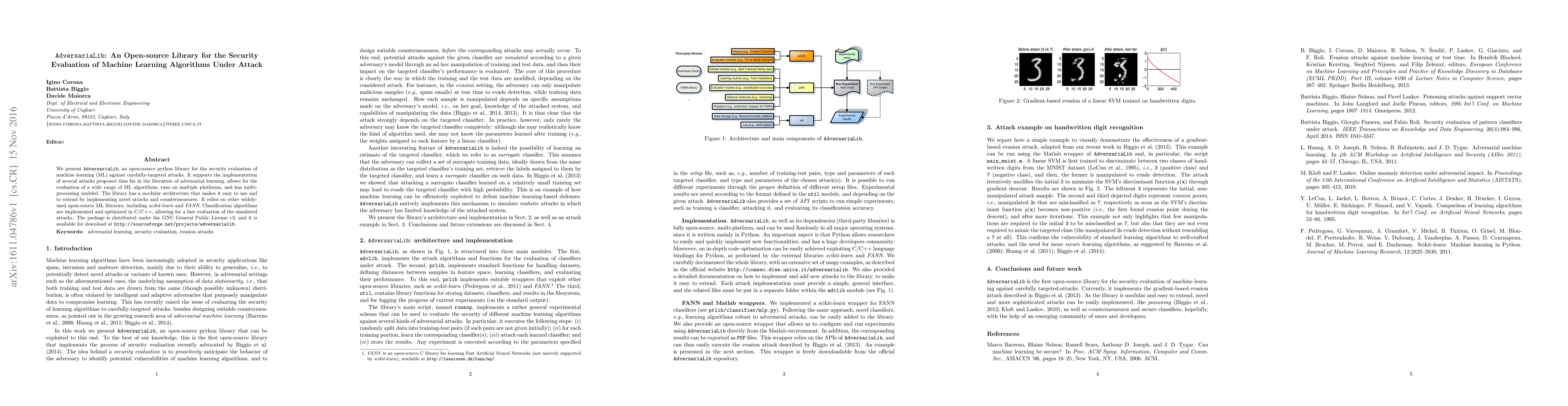 AdversariaLib is an open-source Python library designed for evaluating the security of machine learning algorithms against adversarial attacks. It supports various attack implementations and is compatible with multiple platforms, featuring a modular architecture for easy extension.