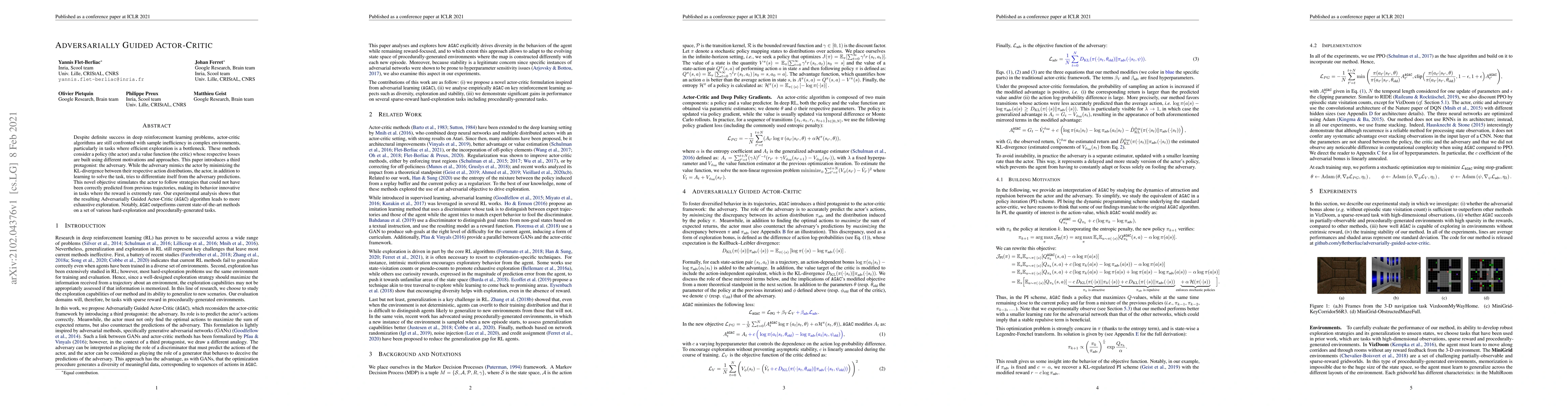 The Adversarially Guided Actor-Critic (AGAC) algorithm introduces an adversary to enhance actor-critic methods, encouraging the actor to explore more innovative strategies by differentiating itself from the adversary's predictions. This approach leads to more exhaustive exploration and outperforms current methods on tasks requiring efficient exploration.