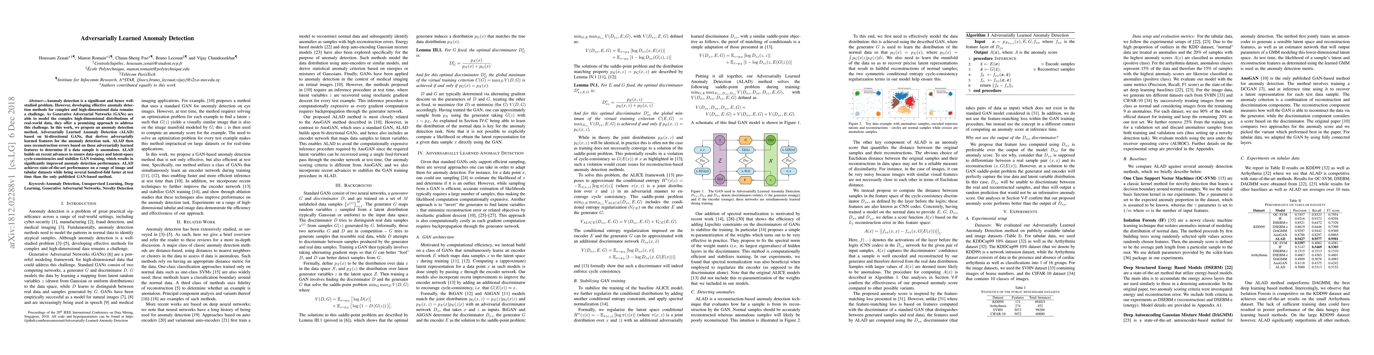 Adversarially Learned Anomaly Detection (ALAD) leverages Generative Adversarial Networks (GANs) to identify anomalies in complex, high-dimensional data by learning features through adversarial training. ALAD achieves state-of-the-art performance and is significantly faster than existing GAN-based methods.