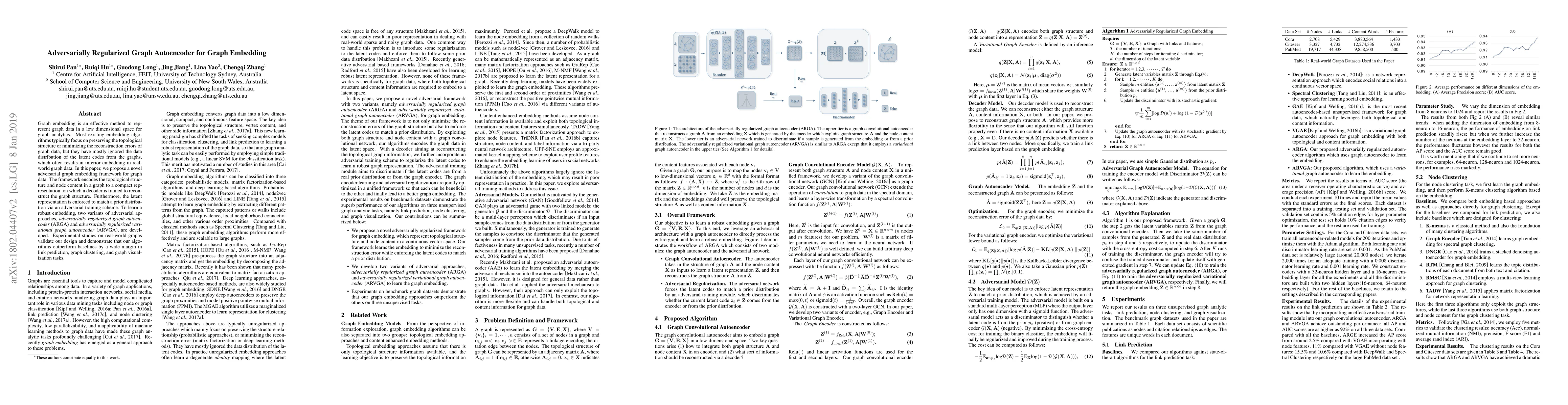 This paper introduces a novel adversarial graph embedding framework that enhances the representation of graph data by incorporating adversarial training to match the latent codes to a prior distribution, improving performance over baselines in link prediction, graph clustering, and visualization. The proposed adversarially regularized graph autoencoder (ARGA) and adversarially regularized variational graph autoencoder (ARVGA) outperform existing methods.