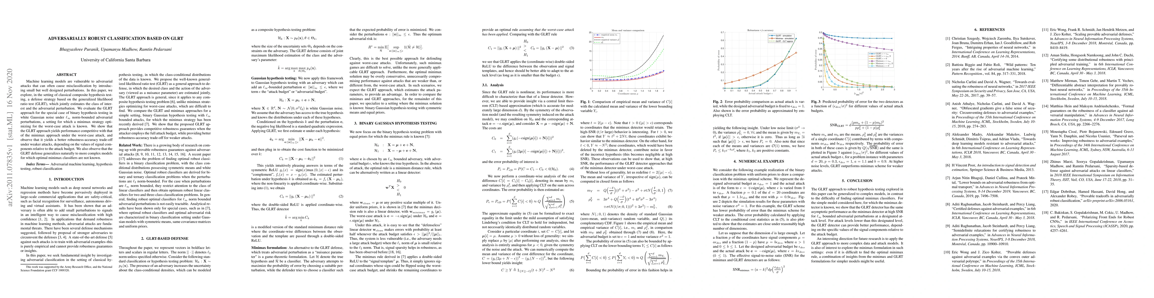 Machine learning models are vulnerable to adversarial attacks that can often cause misclassification by introducing small but well designed perturbations. In this paper, we explore, in the setting of classical composite hypothesis testing, a defense strategy based on the generalized likelihood ratio test (GLRT), which jointly estimates the class of interest and the adversarial perturbation. We evaluate the GLRT approach for the special case of binary hypothesis testing in white Gaussian noise under $\ell_{\infty}$ norm-bounded adversarial perturbations, a setting for which a minimax strategy optimizing for the worst-case attack is known. We show that the GLRT approach yields performance competitive with that of the minimax approach under the worst-case attack, and observe that it yields a better robustness-accuracy trade-off under weaker attacks, depending on the values of signal components relative to the attack budget. We also observe that the GLRT defense generalizes naturally to more complex models for which optimal minimax classifiers are not known.