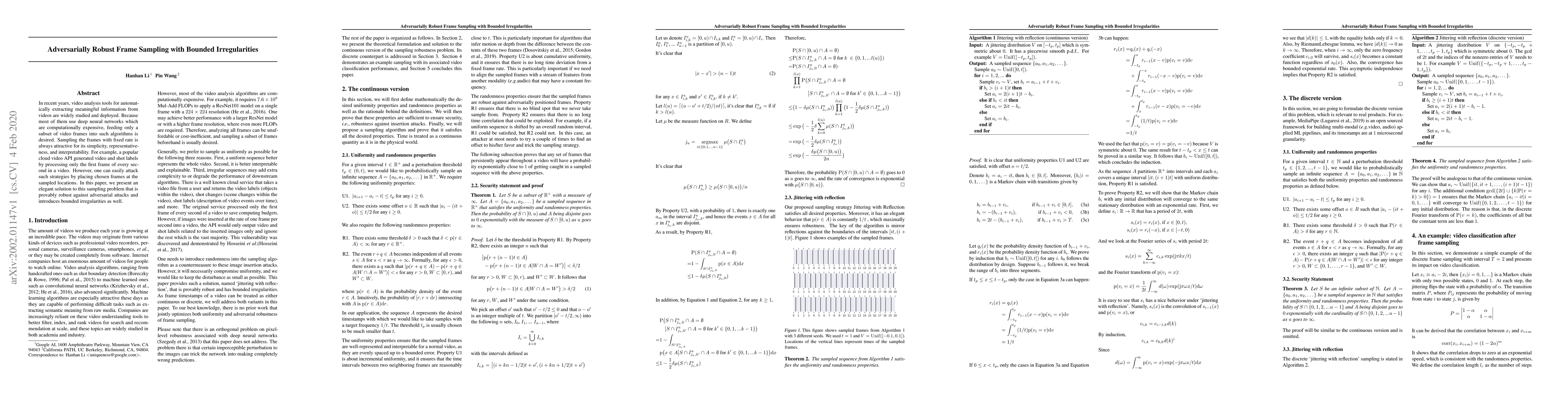 In recent years, video analysis tools for automatically extracting meaningful information from videos are widely studied and deployed. Because most of them use deep neural networks which are computationally expensive, feeding only a subset of video frames into such algorithms is desired. Sampling the frames with fixed rate is always attractive for its simplicity, representativeness, and interpretability. For example, a popular cloud video API generated video and shot labels by processing only the first frame of every second in a video. However, one can easily attack such strategies by placing chosen frames at the sampled locations. In this paper, we present an elegant solution to this sampling problem that is provably robust against adversarial attacks and introduces bounded irregularities as well.