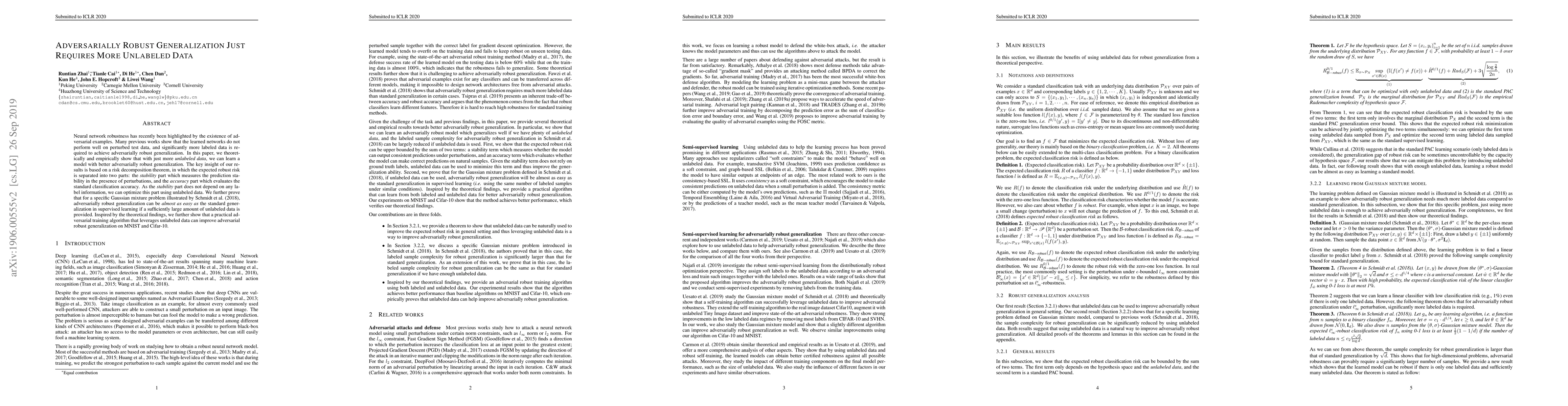 This paper demonstrates that increasing the amount of unlabeled data can enhance adversarially robust generalization in neural networks, theoretically proving that the stability part of the robust risk can be optimized using unlabeled data. Practical experiments on MNIST and Cifar-10 show improved robustness using an adversarial training algorithm that incorporates unlabeled data.