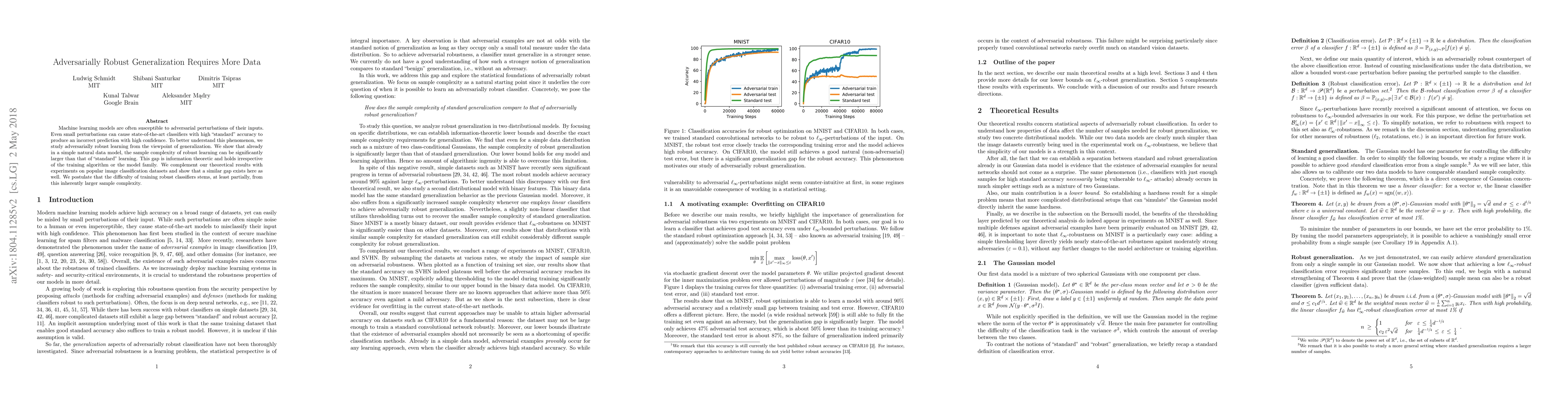Machine learning models are often susceptible to adversarial perturbations of their inputs. Even small perturbations can cause state-of-the-art classifiers with high "standard" accuracy to produce an incorrect prediction with high confidence. To better understand this phenomenon, we study adversarially robust learning from the viewpoint of generalization. We show that already in a simple natural data model, the sample complexity of robust learning can be significantly larger than that of "standard" learning. This gap is information theoretic and holds irrespective of the training algorithm or the model family. We complement our theoretical results with experiments on popular image classification datasets and show that a similar gap exists here as well. We postulate that the difficulty of training robust classifiers stems, at least partially, from this inherently larger sample complexity.