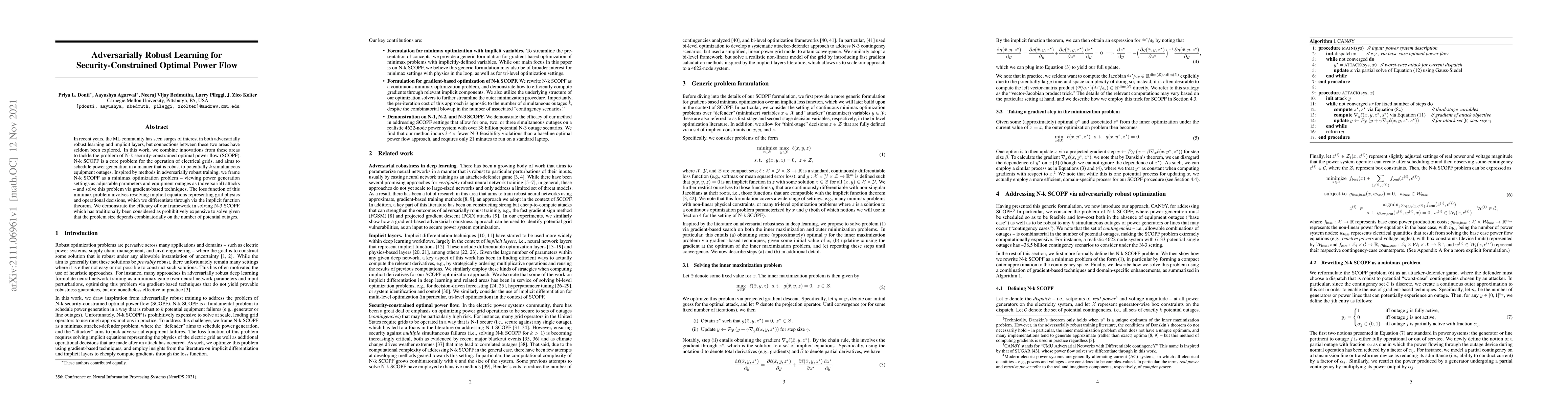 This paper combines adversarially robust learning with implicit layers to address N-k security-constrained optimal power flow (SCOPF), framing it as a minimax optimization problem. The authors demonstrate their approach's effectiveness in solving N-3 SCOPF, traditionally deemed computationally prohibitive.