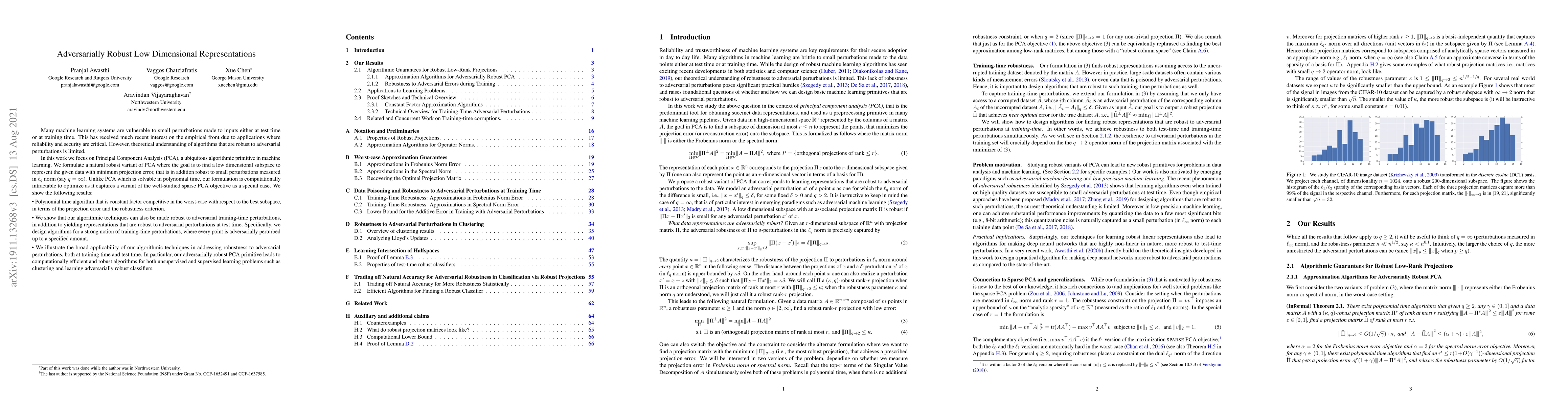 This paper proposes a robust variant of Principal Component Analysis (PCA) to create low-dimensional representations that are resilient to adversarial perturbations. It presents a polynomial time algorithm that achieves constant factor competitiveness in terms of projection error and robustness, and extends the approach to handle adversarial training-time perturbations, enhancing robustness in both unsupervised and supervised learning tasks.