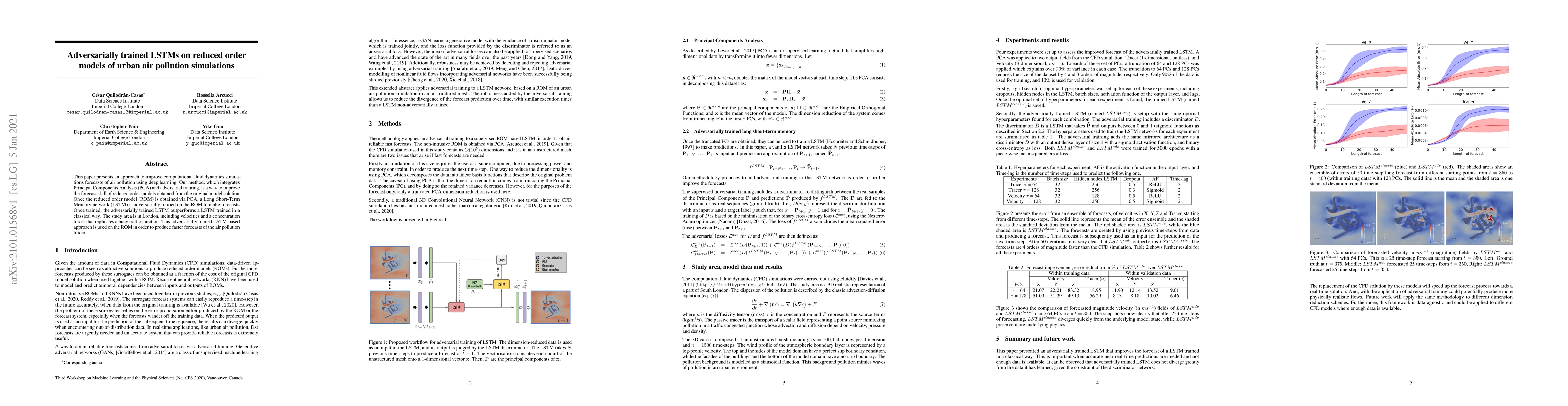 This paper presents an approach to improve computational fluid dynamics simulations forecasts of air pollution using deep learning. Our method, which integrates Principal Components Analysis (PCA) and adversarial training, is a way to improve the forecast skill of reduced order models obtained from the original model solution. Once the reduced-order model (ROM) is obtained via PCA, a Long Short-Term Memory network (LSTM) is adversarially trained on the ROM to make forecasts. Once trained, the adversarially trained LSTM outperforms a LSTM trained in a classical way. The study area is in London, including velocities and a concentration tracer that replicates a busy traffic junction. This adversarially trained LSTM-based approach is used on the ROM in order to produce faster forecasts of the air pollution tracer.