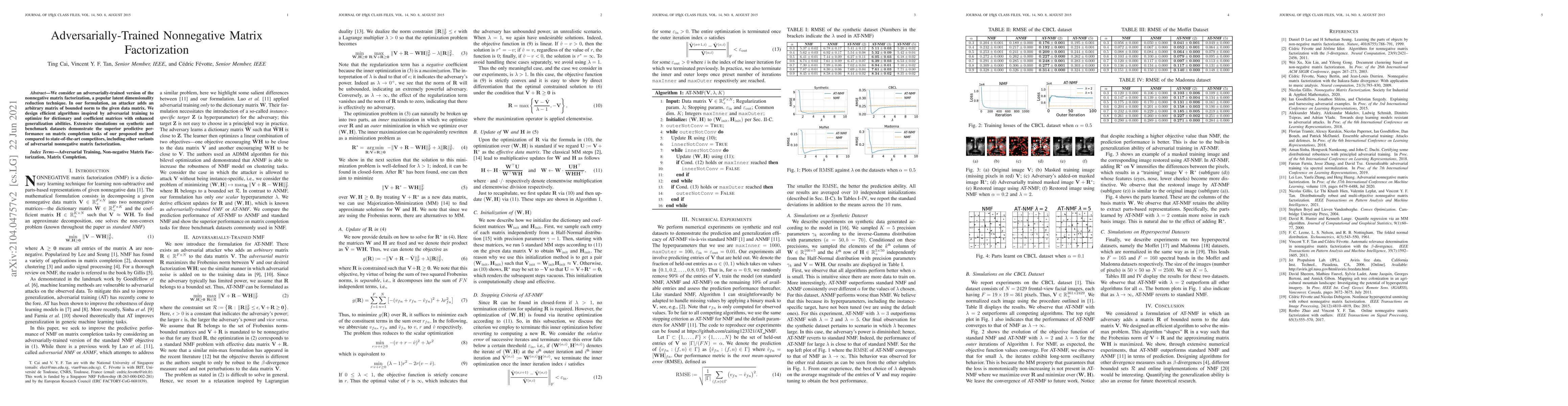 This paper proposes an adversarially-trained version of nonnegative matrix factorization to improve generalization by simulating attacks, and demonstrates superior predictive performance on matrix completion tasks compared to other methods. Efficient algorithms are designed to optimize dictionary and coefficient matrices under adversarial perturbations.
