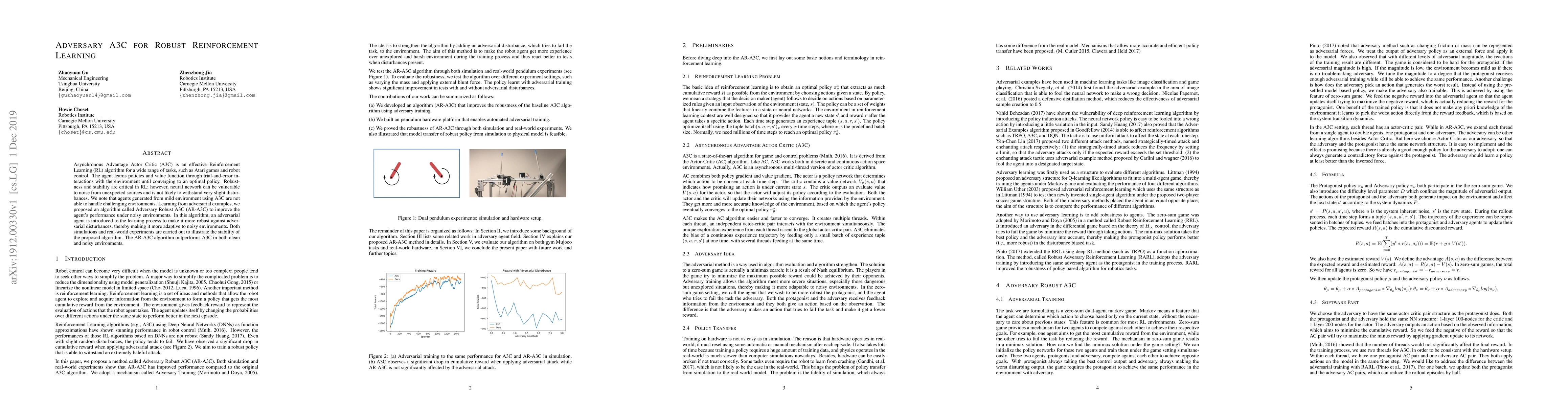 The paper proposes Adversary Robust A3C (AR-A3C), an enhanced version of A3C that incorporates adversarial training to improve the robustness of reinforcement learning agents in noisy environments. The AR-A3C algorithm demonstrates superior performance compared to standard A3C in both clean and noisy conditions through simulations and real-world experiments.