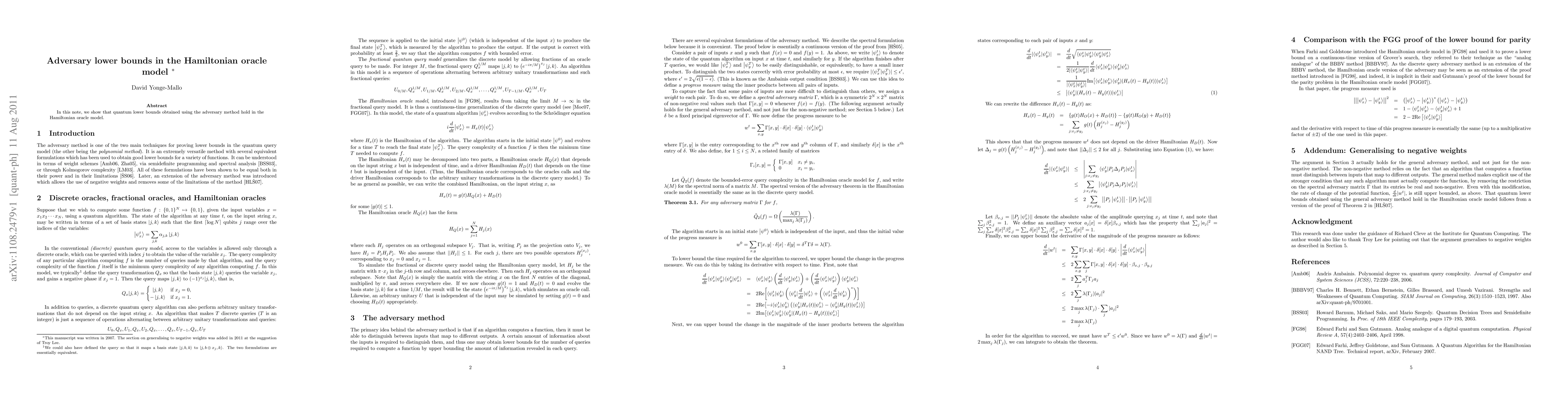 Summary: This paper demonstrates that quantum lower bounds derived from the adversary method remain valid in the Hamiltonian oracle model, highlighting the robustness of these bounds across different quantum computational frameworks.