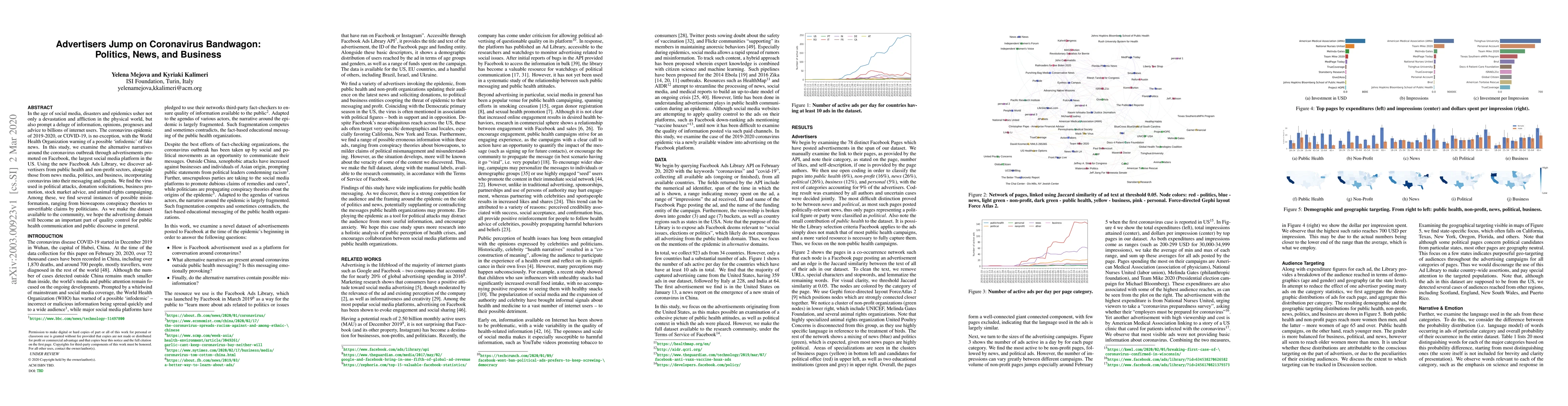 In the age of social media, disasters and epidemics usher not only a devastation and affliction in the physical world, but also prompt a deluge of information, opinions, prognoses and advice to billions of internet users. The coronavirus epidemic of 2019-2020, or COVID-19, is no exception, with the World Health Organization warning of a possible "infodemic" of fake news. In this study, we examine the alternative narratives around the coronavirus outbreak through advertisements promoted on Facebook, the largest social media platform in the US. Using the new Facebook Ads Library, we discover advertisers from public health and non-profit sectors, alongside those from news media, politics, and business, incorporating coronavirus into their messaging and agenda. We find the virus used in political attacks, donation solicitations, business promotion, stock market advice, and animal rights campaigning. Among these, we find several instances of possible misinformation, ranging from bioweapons conspiracy theories to unverifiable claims by politicians. As we make the dataset available to the community, we hope the advertising domain will become an important part of quality control for public health communication and public discourse in general.