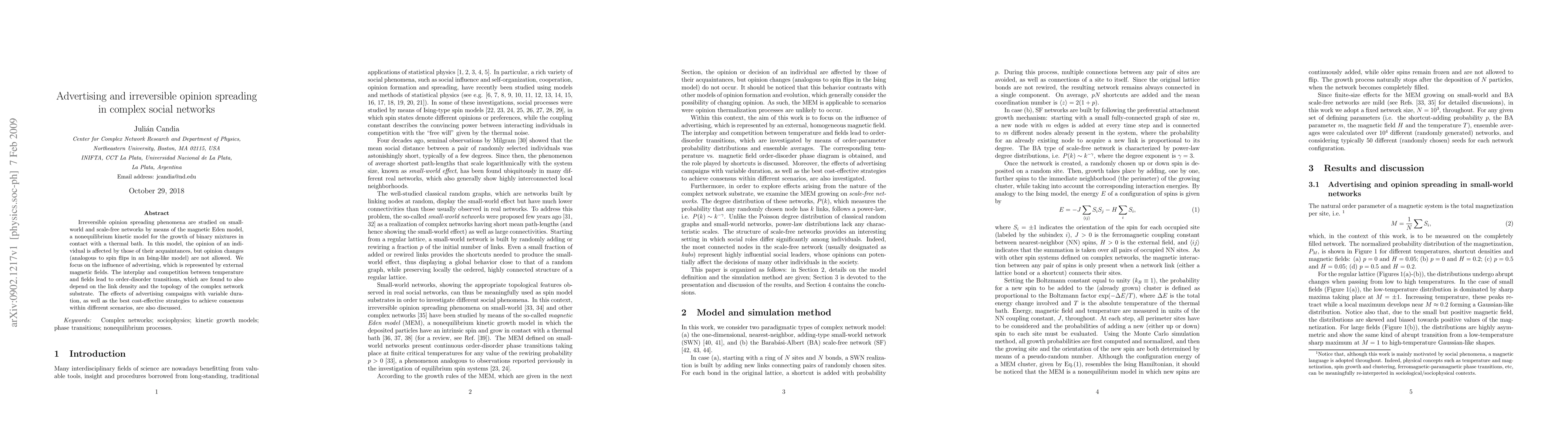 This paper investigates irreversible opinion spreading in complex social networks using the magnetic Eden model, focusing on the influence of advertising represented by external magnetic fields. It explores the interplay between temperature, advertising, and network topology, revealing order-disorder transitions and optimal strategies for achieving consensus.