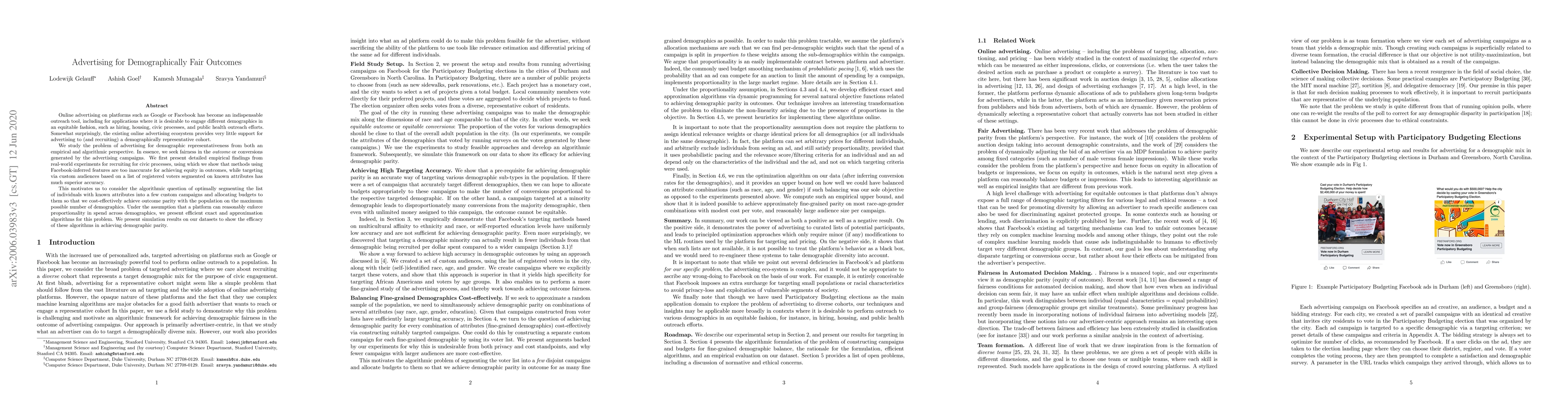 Online advertising on platforms such as Google or Facebook has become an indispensable outreach tool, including for applications where it is desirable to engage different demographics in an equitable fashion, such as hiring, housing, civic processes, and public health outreach efforts. Somewhat surprisingly, the existing online advertising ecosystem provides very little support for advertising to (and recruiting) a demographically representative cohort. We study the problem of advertising for demographic representativeness from both an empirical and algorithmic perspective. In essence, we seek fairness in the outcome or conversions generated by the advertising campaigns. We first present detailed empirical findings from real-world experiments for recruiting for civic processes, using which we show that methods using Facebook-inferred features are too inaccurate for achieving equity in outcomes, while targeting via custom audiences based on a list of registered voters segmented on known attributes has much superior accuracy. This motivates us to consider the algorithmic question of optimally segmenting the list of individuals with known attributes into a few custom campaigns and allocating budgets to them so that we cost-effectively achieve outcome parity with the population on the maximum possible number of demographics. Under the assumption that a platform can reasonably enforce proportionality in spend across demographics, we present efficient exact and approximation algorithms for this problem. We present simulation results on our datasets to show the efficacy of these algorithms in achieving demographic parity.