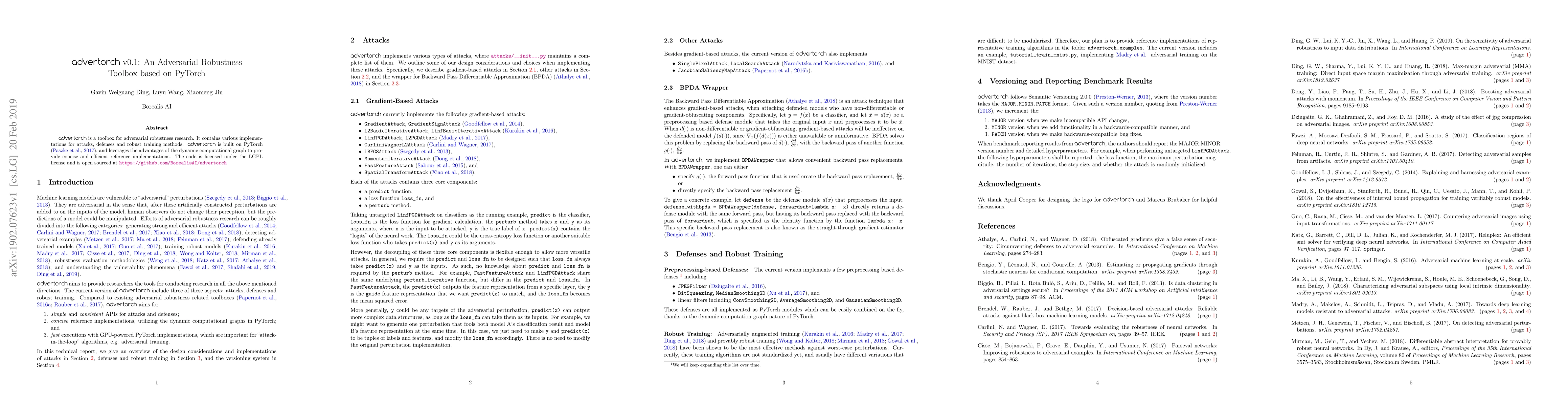 Advertorch v0.1 is a PyTorch-based toolbox for adversarial robustness research, offering implementations for attacks, defenses, and robust training methods. It is open-sourced under the LGPL license and available at https://github.com/BorealisAI/advertorch.