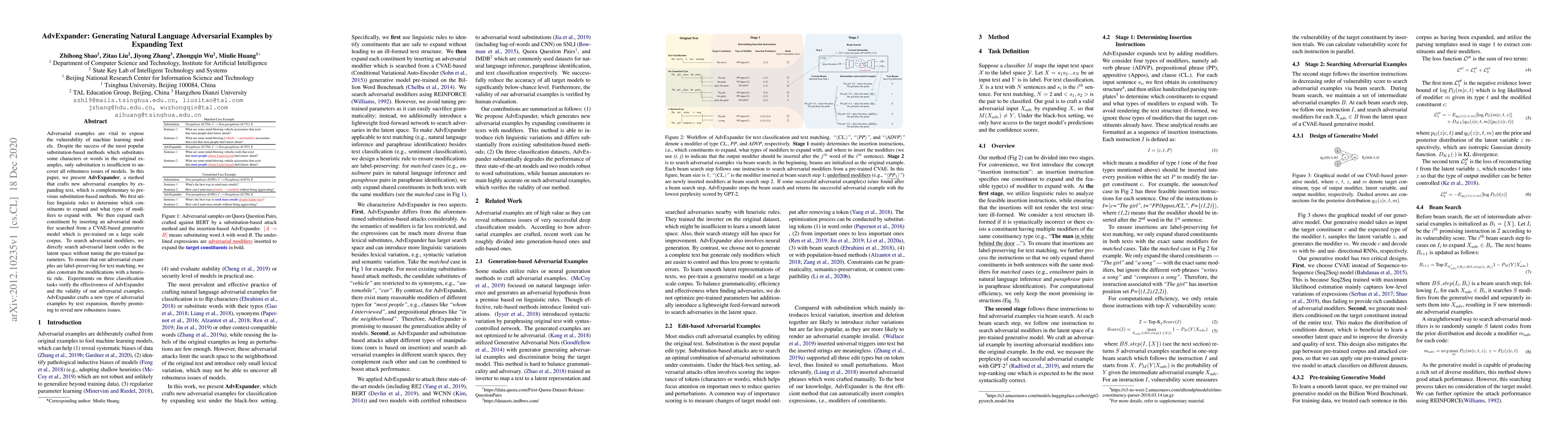 AdvExpander introduces a novel method for generating adversarial examples by expanding text rather than substituting parts, using linguistic rules and a CVAE-based generative model to create label-preserving modifications that reveal new model vulnerabilities. Experiments show its effectiveness in uncovering robustness issues in three classification tasks.
